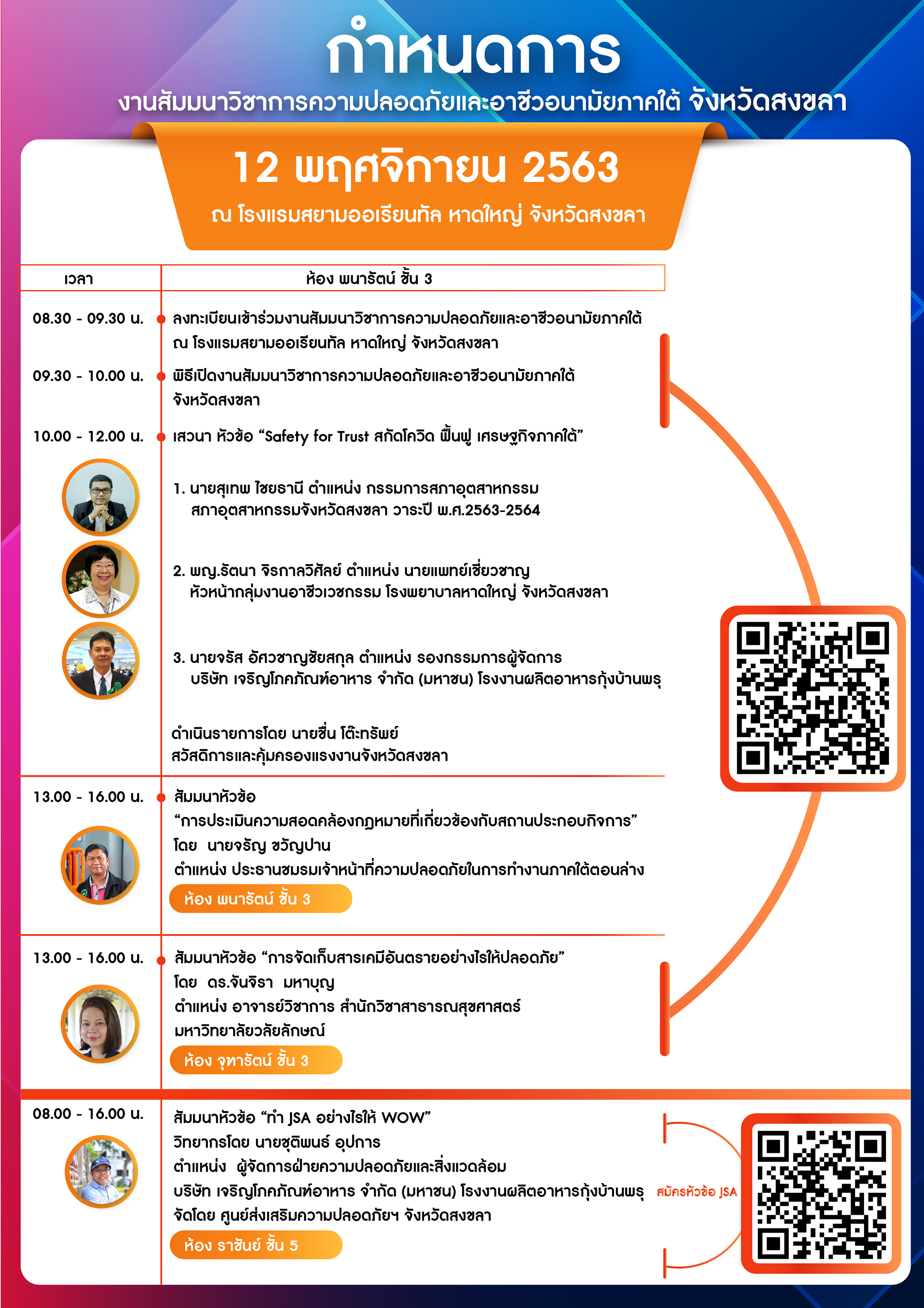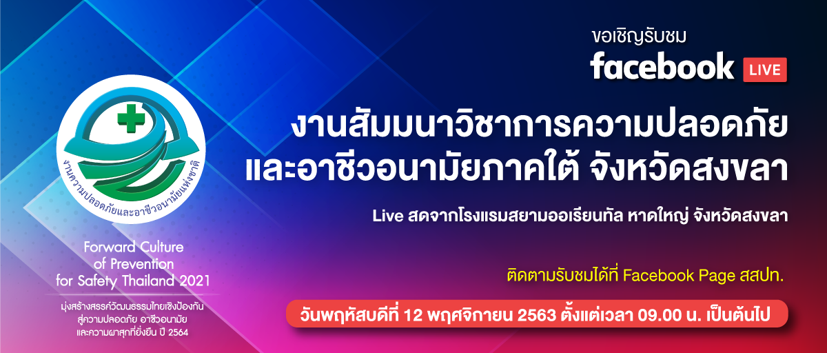 สถาบันส่งเสริมความปลอดภัย อาชีวอนามัย และสภาพแวดล้อมในการทำงาน (องค์การมหาชน) ร่วมกับสำนักงานสวัสดิการและคุ้มครองแรงงานจังหวัดสงขลา ศูนย์ความปลอดภัยในการทำงานเขต 8 จังหวัดสุราษฏร์ธานี ศูนย์ความปลอดภัยในการทำงาน เขต 9 จังหวัดสงขลา ชมรมเจ้าหน้าที่ความปลอดภัยในการทำงานจังหวัดสงขลา ชมรมเจ้าหน้าที่ความปลอดภัยในการทำงานภาคใต้ตอนบน และชมรมเจ้าหน้าที่ความปลอดภัยในการทำงานภาคใต้ตอนล่าง กำหนดจัดงานสัมมนาวิชาการความปลอดภัยและอาชีวอนามัยภาคใต้ จังหวัดสงขลา ในวันที่ 12 พฤศจิกายน 2563 ณ โรงแรมสยามออเรียนทัล หาดใหญ่ จังหวัดสงขลา ภายใต้ตีมงาน “Forward Culture of Prevention for Safety Thailand 2021 มุ่งสร้างสรรค์วัฒนธรรมไทยเชิงป้องกัน สู่ความปลอดภัย อาชีวอนามัย และความผาสุกที่ยั่งยืน ปี 2564” ซึ่งภายในงานกำหนดให้มีการสัมมนาวิชาการและนิทรรศการด้านความปลอดภัย