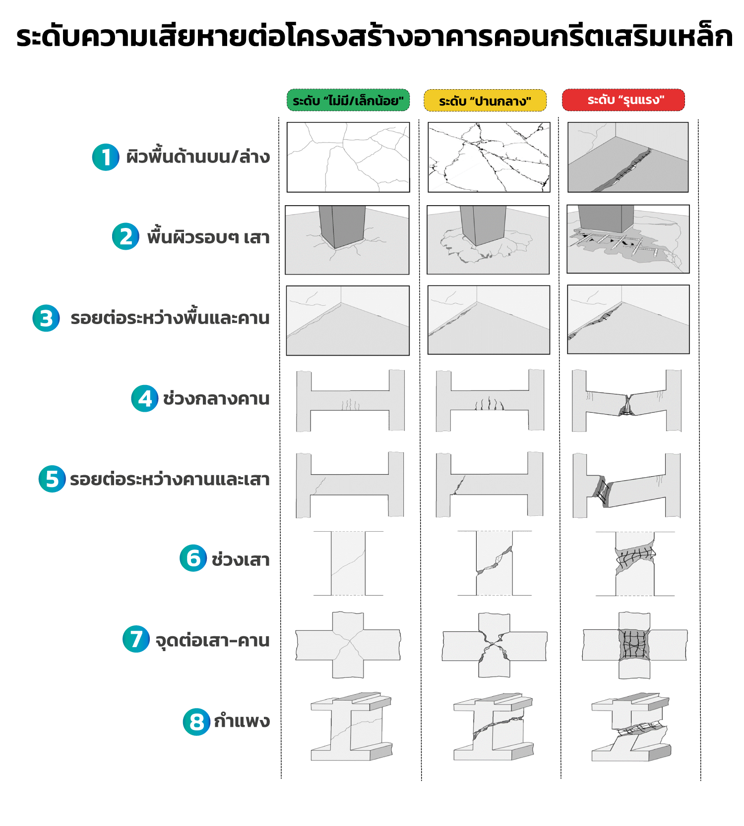ที่มา คู่มือการสำรวจความเสียหายขั้นต้นของโครงสร้างอาคารหลังจากเหตุการณ์แผ่นดินไหว กรมโยธาธิการและผังเมือง กระทรวงมหาดไทย พ.ศ. 2560