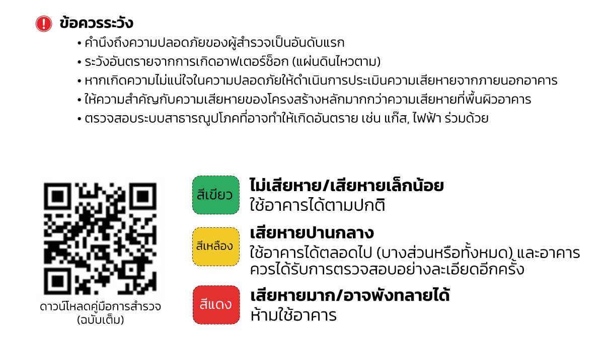 - ระมัดระวังภัยที่อาจเกิดขึ้นได้จากเหตุการณ์แผ่นดินไหวตาม (Aftershock)