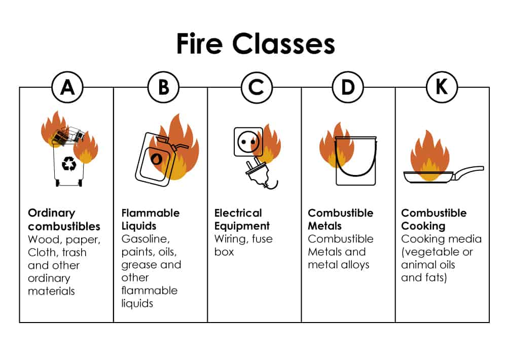 1. Class A เป็นเชื้อเพลิงพื้นฐานทั่ว ๆ ไปที่เป็นของแข็งจำพวก ไม้ กระดาษ เสื้อผ้า พลาสติก ยาง ฯลฯ เมื่อเผาไหม้แล้วจะเหลือเถ้าถ่าน