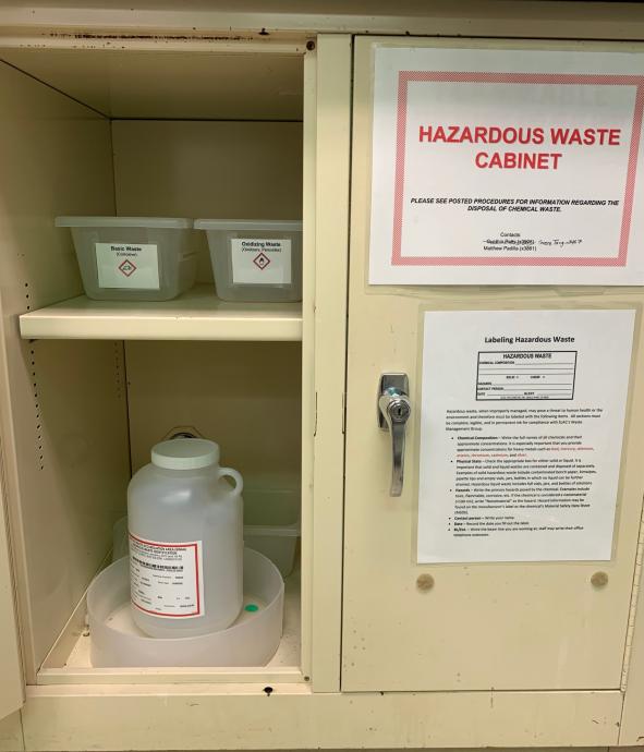 - เก็บของเสียประเภทไวไฟในห้องปฏิบัติการไม่เกิน 10 แกลลอน (38 ลิตร) ถ้ามีเกิน 10 แกลลอน ต้องจัดเก็บไว้ในตู้ สำหรับเก็บสารไวไฟโดยเฉพาะ