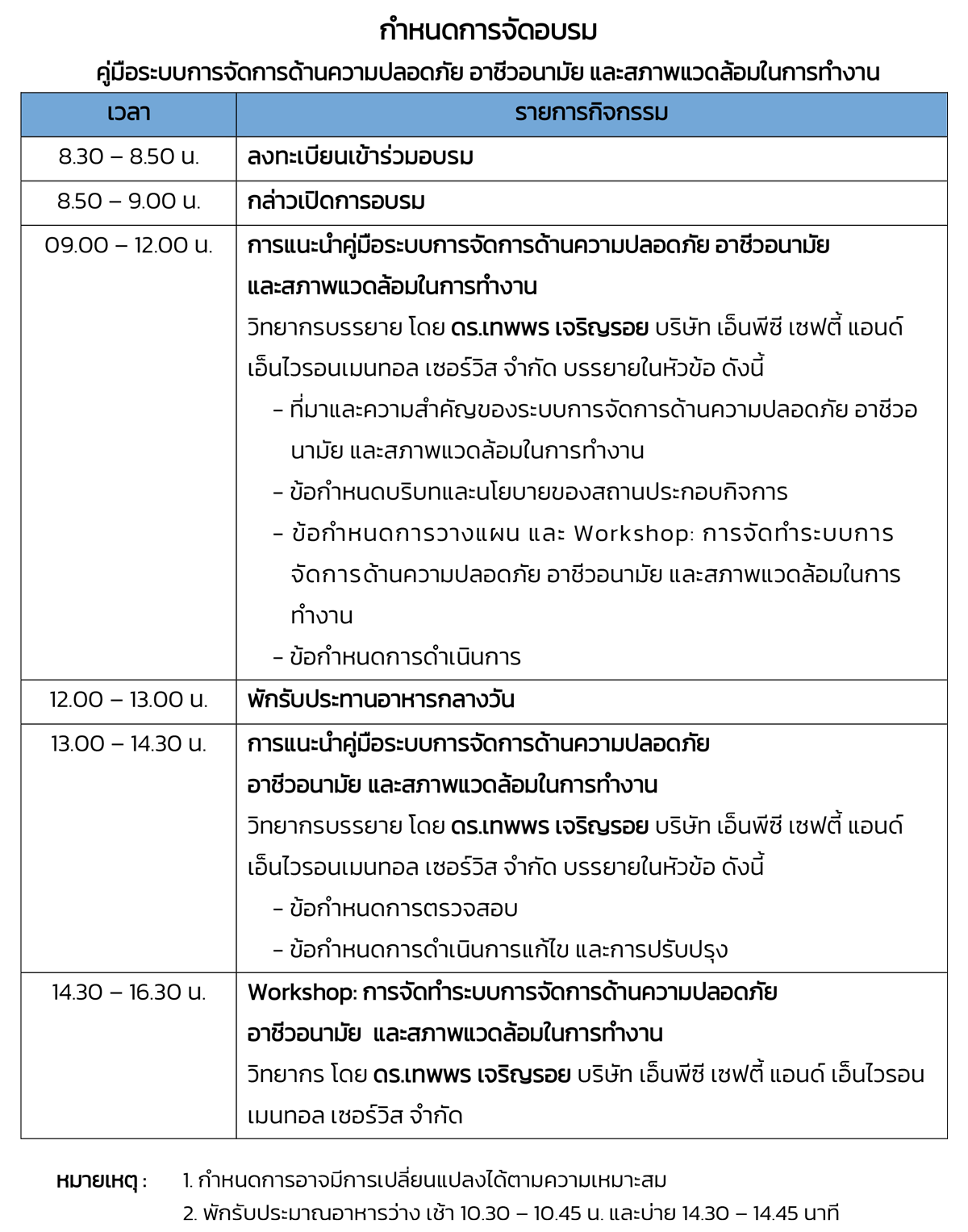 สสปท. ขอเชิญผู้สนใจสมัครเข้าอบรมหัวข้อ "คู่มือระบบการจัดการด้านความปลอดภัย อาชีวอนามัย และสภาพแวดล้อมในการทำงาน"