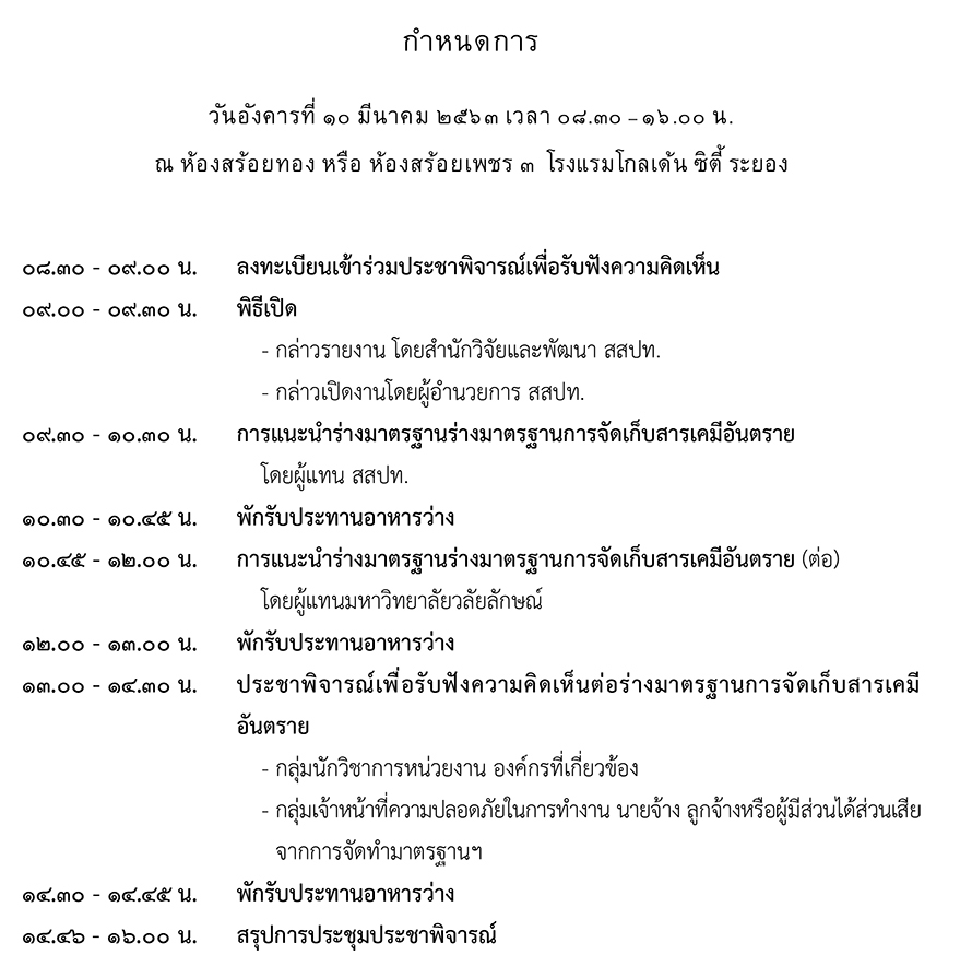 สถาบันส่งเสริมความปลอดภัย อาชีวอนามัย และสภาพแวดล้อมในการทำงาน (องค์การมหาชน) ขอเชิญผู้สนใจเข้าร่วมรับฟังและแสดงความคิดเห็น “การประชุมประชาพิจารณ์เพื่อรับฟังความคิดเห็นสำหรับร่างมาตรฐานการจัดเก็บสารเคมีอันตราย” ในวันอังคารที่ ๑๐ มีนาคม ๒๕๖๓ ณ โรงแรมโกลเด้น ซิตี้ ระยอง การประชุมครั้งนี้จัดขึ้นเพื่อเป็นการเปิดโอกาสให้กับเจ้าหน้าที่ความปลอดภัยในการทำงาน นักวิชาการ ผู้ทรงคุณวุฒิ และผู้ที่เกี่ยวข้อง ได้มีส่วนร่วมในการจัดทำหรือยกร่างร่างมาตรฐานให้มีความสมบูรณ์ หลังจากนั้นจะนำข้อมูลที่ได้ไปประกอบการจัดทำร่างมาตรฐานและเผยแพร่ให้สถานประกอบกิจการที่เกี่ยวข้องสามารถนำมาตรฐานนี้ไปใช้ เพื่อให้เกิดความปลอดภัยในการทำงาน มีความถูกต้องตามกฎหมายต่อไป