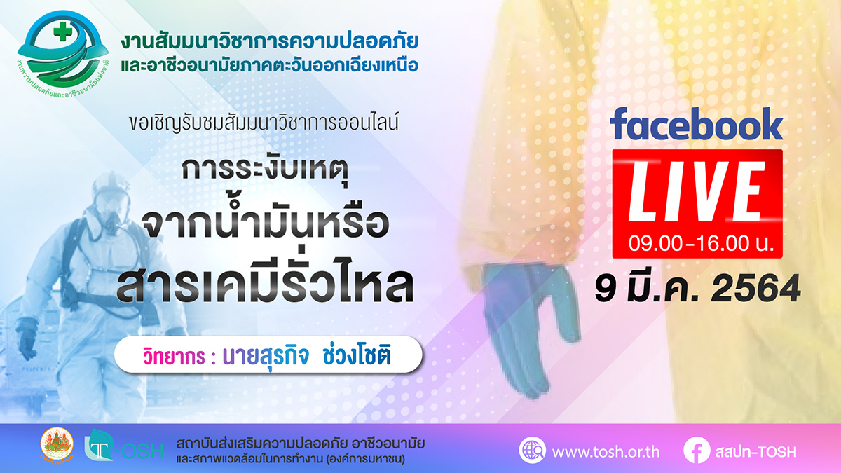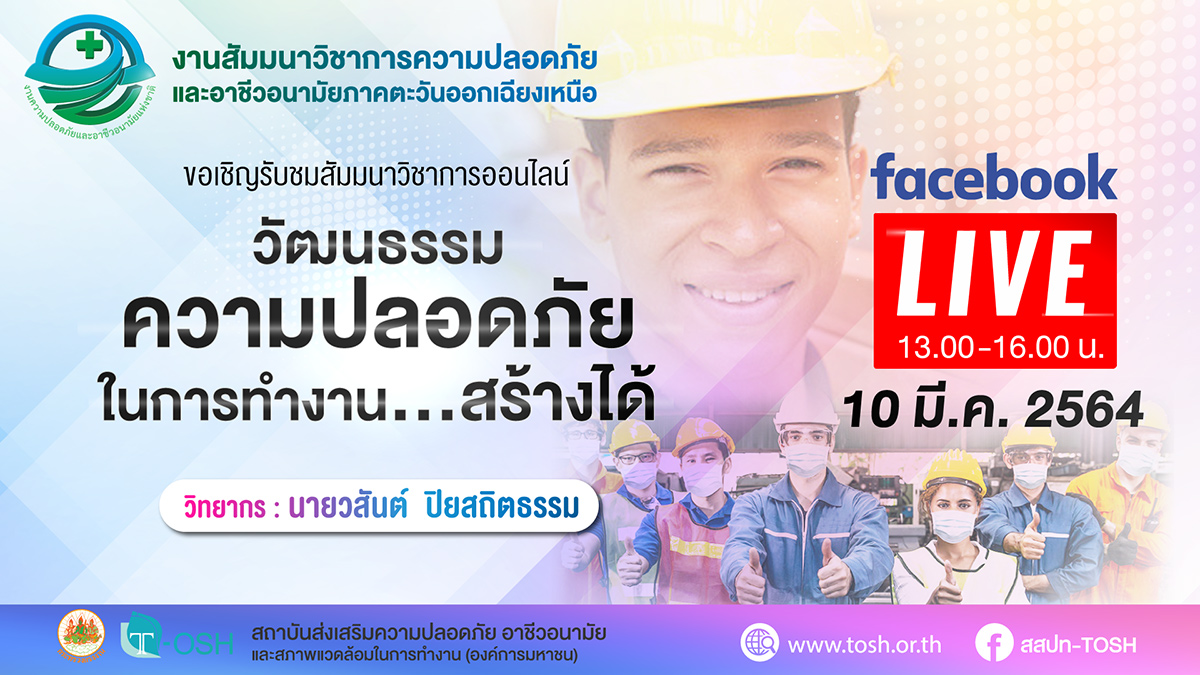 สถาบันส่งเสริมความปลอดภัย อาชีวอนามัย และสภาพแวดล้อมในการทำงาน (องค์การมหาชน) กำหนดจัดงานสัมมนาวิชาการความปลอดภัยและอาชีวอนามัยภาคตะวันออกเฉียงเหนือ  ระหว่างวันที่ 9-10 มีนาคม 2564   และเนื่องด้วยปัจจุบันสถานการณ์การแพร่ระบาดของโรคติดเชื้อไวรัสโคโรนา (COVID-19) ยังน่าเป็นห่วงและต้องเฝ้าระวังอย่างต่อเนื่อง  จึงได้พิจารณาจัดงานให้เหมาะสมกับสถานการณ์ปัจจุบัน  โดยใช้รูปแบบการจัดงานสัมมนาวิชาการในรูปแบบออนไลน์แทน   สถาบันฯ จึงขอเรียนเชิญเจ้าหน้าที่ความปลอดภัยในการทำงาน  สถานประกอบกิจการหรือหน่วยงานที่สนใจ  เข้าร่วมสัมมนาวิชาการออนไลน์ (ฟรีไม่มีค่าใช้จ่าย)  เพื่อเพิ่มพูนความรู้ในเรื่องความปลอดภัย อาชีวอนามัย และสภาพแวดล้อมในการทำงาน  ทั้งนี้ท่านสามารถรับชมการถ่ายทอดสดการสัมมนาผ่านทาง Facebook Live เพจ สสปท. ในวันและเวลาตามกำหนดการด้านล่างนี้