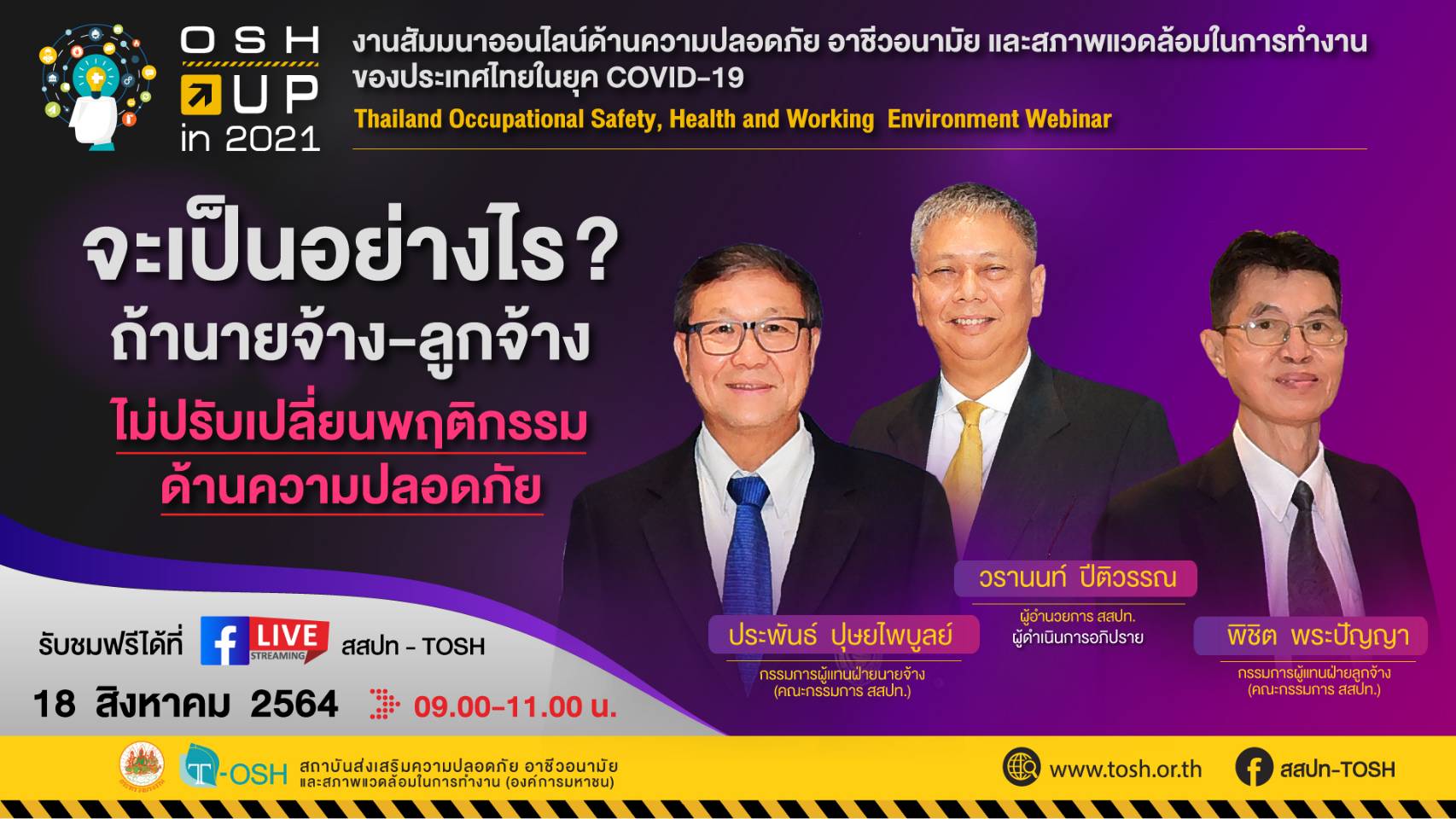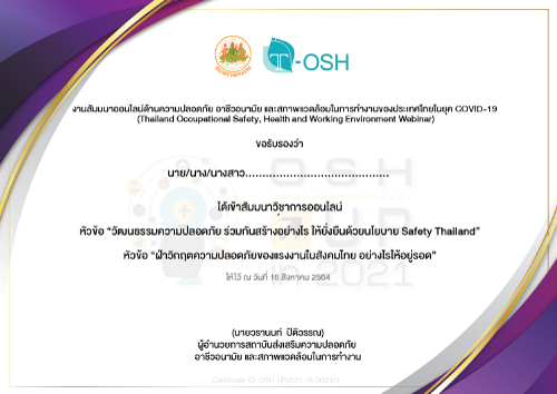 สถาบันส่งเสริมความปลอดภัย อาชีวอนามัย และสภาพแวดล้อมในการทำงาน (องค์การมหาชน) หรือ สสปท. ขอเชิญท่านผู้สนใจเข้าร่วมอบรมสัมมนาทางวิชาการ เพื่อพัฒนาองค์ความรู้ด้านความปลอดภัย อาชีวอนามัย ในหัวข้อที่หลากหลายและน่าสนใจ โดยวิทยากรผู้ทรงคุณวุฒิที่มากด้วยประสบการณ์อันดับต้น ๆ ของประเทศไทย ภายใต้ธีมงาน “OSH UP 2021 สร้างต้นแบบการเรียนรู้ด้านความปลอดภัย อาชีวอนามัย และสภาพแวดล้อมในการทำงาน เพื่อเพิ่มพูนความรู้และประสบการณ์ที่กว้างไกล (OSH UP 2021: Creating the Sharp Archetypes in OSH Knowledge. Certainly, Broaden Your Horizons) สมัครฟรีไม่มีค่าใช้จ่าย ผู้เข้าร่วมสัมมนาครบตามกำหนดและทำแบบประเมินหลังการอบรมตอนท้ายของวัน จะได้รับใบประกาศออนไลน์ (ตามแต่ละวันที่ท่านเข้าอบรม)