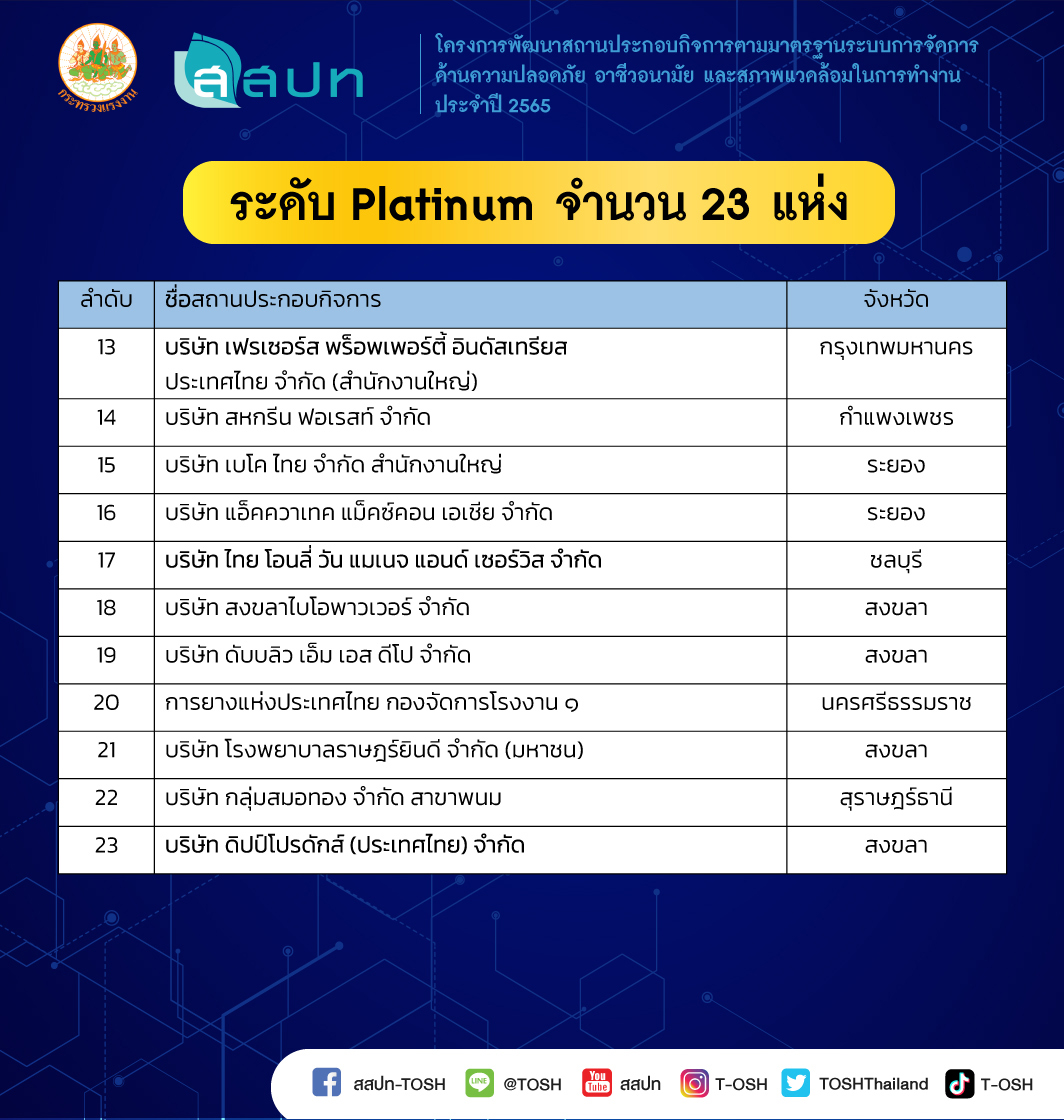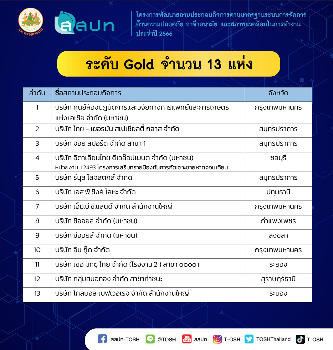 หมายเหตุ กำหนดการมอบประกาศเกียรติคุณแก่สถานประกอบกิจการ จะจัดขึ้นภายในเดือนมีนาคม 256๖ และจะแจ้งกำหนดการให้ทราบอีกครั้งในภายหลัง สามารถติดต่อสอบถามเพิ่มเติม : 061-4201372 หรืออีเมล คุณเกศสุดา รักษากุล This email address is being protected from spambots. You need JavaScript enabled to view it. หรือ คุณจิรนันทน์ อินทร์มณี This email address is being protected from spambots. You need JavaScript enabled to view it.