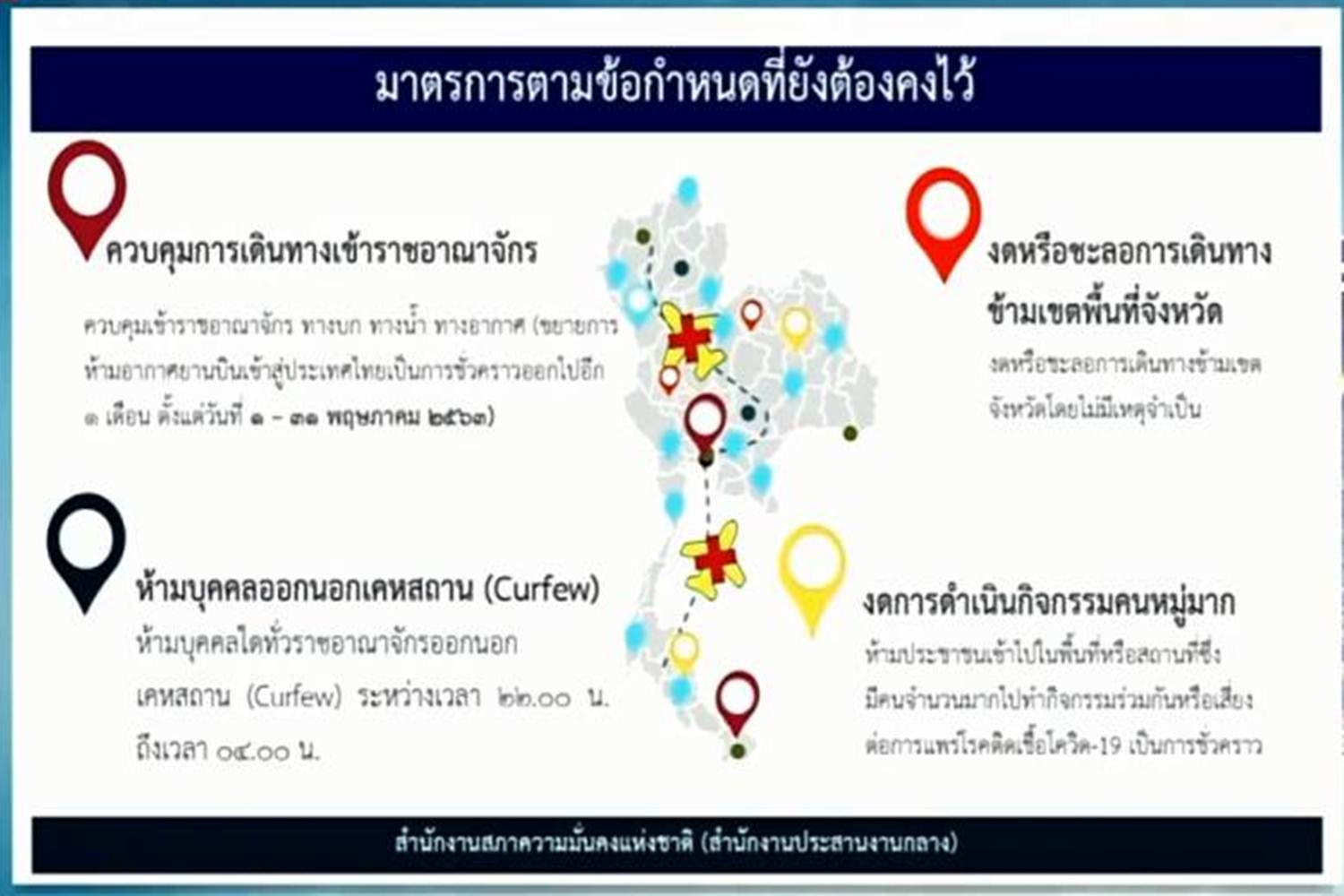 - ควบคุมการเดินทางเข้าราชอาณาจักร ทางบก ทางน้ำ ทางอากาศ (ขยายการห้ามอากาศยานบินเข้าสู่ประเทศไทยเป็นการชั่วคราวออกไปอีก 1 เดือน ตั้งแต่วันที่ 1-31 พ.ค.63)