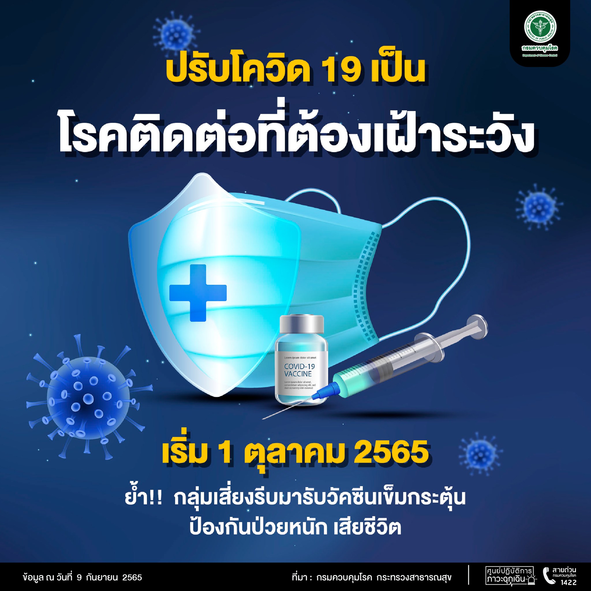 วันที่ 1 ตุลาคม 2565 นี้ “โควิด-19” จะเป็นโรคติดต่อเฝ้าระวัง ย้ำให้กลุ่มเสี่ยง 608 ยังต้องมารับวัคซีนเข็มกระตุ้น