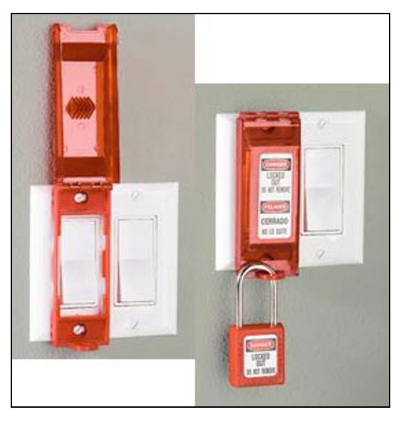 - อุปกรณ์ระบบล็อกและระบบป้ายเตือน (Lock Out/Tag Out Device Application) เป็นอุปกรณ์ที่ใช้ในการตัดแยกพลังงานไฟฟ้าประกอบไปด้วยอุปกรณ์ล็อกและระบบป้ายเตือนซึ่งใช้งานโดยผู้ปฏิบัติงานที่ได้รับมอบหมายหน้าที่เพียงผู้เดียวเท่านั้นและจะต้องติดอยู่กับตัวอุปกรณ์การตัดแยกระบบ จนกว่าการตรวจสอบหรือซ่อมบำรุงจะแล้วเสร็จ