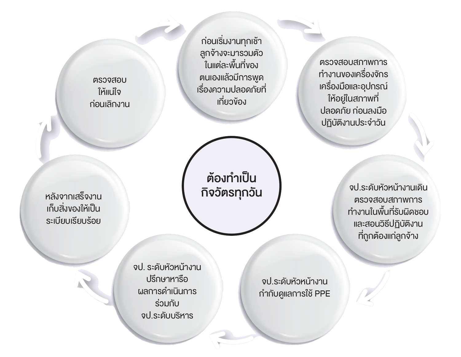 ดังนั้น องค์กรใดที่ต้องการให้การจัดการดังกล่าว เกิดประสิทธิภาพและประสิทธิผลในเชิงป้องกันอย่างเป็นรูปธรรม สามารถที่จะหลีกเลี่ยงการเกิดอุบัติเหตุจากความเสียหายในการทำงานได้ โดยการดำเนินการป้องกันการเกิดอุบัติเหตุที่จะเกิดขึ้นในแต่ละวัน รายสัปดาห์หรือรายเดือน ซึ่งทุกคนที่เกี่ยวข้องในการทำงานในพื้นที่ปฏิบัติงานโดยเฉพาะ จป. ระดับหัวหน้างานจะมีหน้าที่ปฏิบัติให้ถูกต้องในระหว่างการทำงานโดยต้องมีนโยบาย หรือ แผนงานและกิจกรรมการจัดการด้านความปลอดภัยที่ชัดเจนในสถานที่ทำงานขององค์กร และต้องทำเป็นกิจวัตรทุก ๆ วันอย่างสม่ำเสมอ โดยกำหนดบทบาทหน้าที่ให้ จป.ระดับหัวหน้างานเป็นหลักและมีผู้ที่เกี่ยวข้องในการทำงานให้การสนับสนุนดำเนินการ 7 ประการ ดังรูปแผนผังที่แสดงปรากฏพอสังเขป