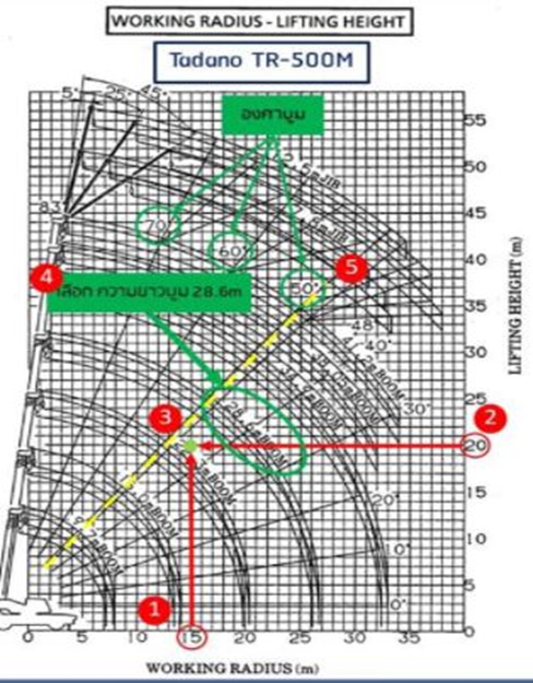 - ลากเส้นจากจุด 1 และ 2 ไปพบกัน ซึ่งจะเห็นว่าจุดที่ได้อยู่ใต้สวิงของบูม ยาว 28.6 m
