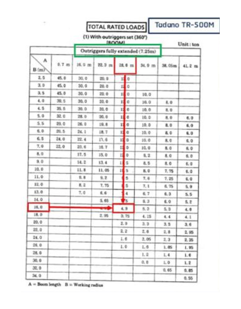 4. พอเรารู้ค่าความยาวบูม A ที่จะต้องยืดออก เราจะสามารถไปอ่านค่าตารางยก (Loading Chart) ได้