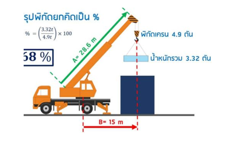น้ำหนักการยกทั้งหมด = น้ำหนักชิ้นงาน (3 ตัน) + น้ำหนักสลิง และตะขอเครน (290 kg) + น้ำหนักของอุปกรณ์ช่วยยก (30 kg) = 3.32 ตัน