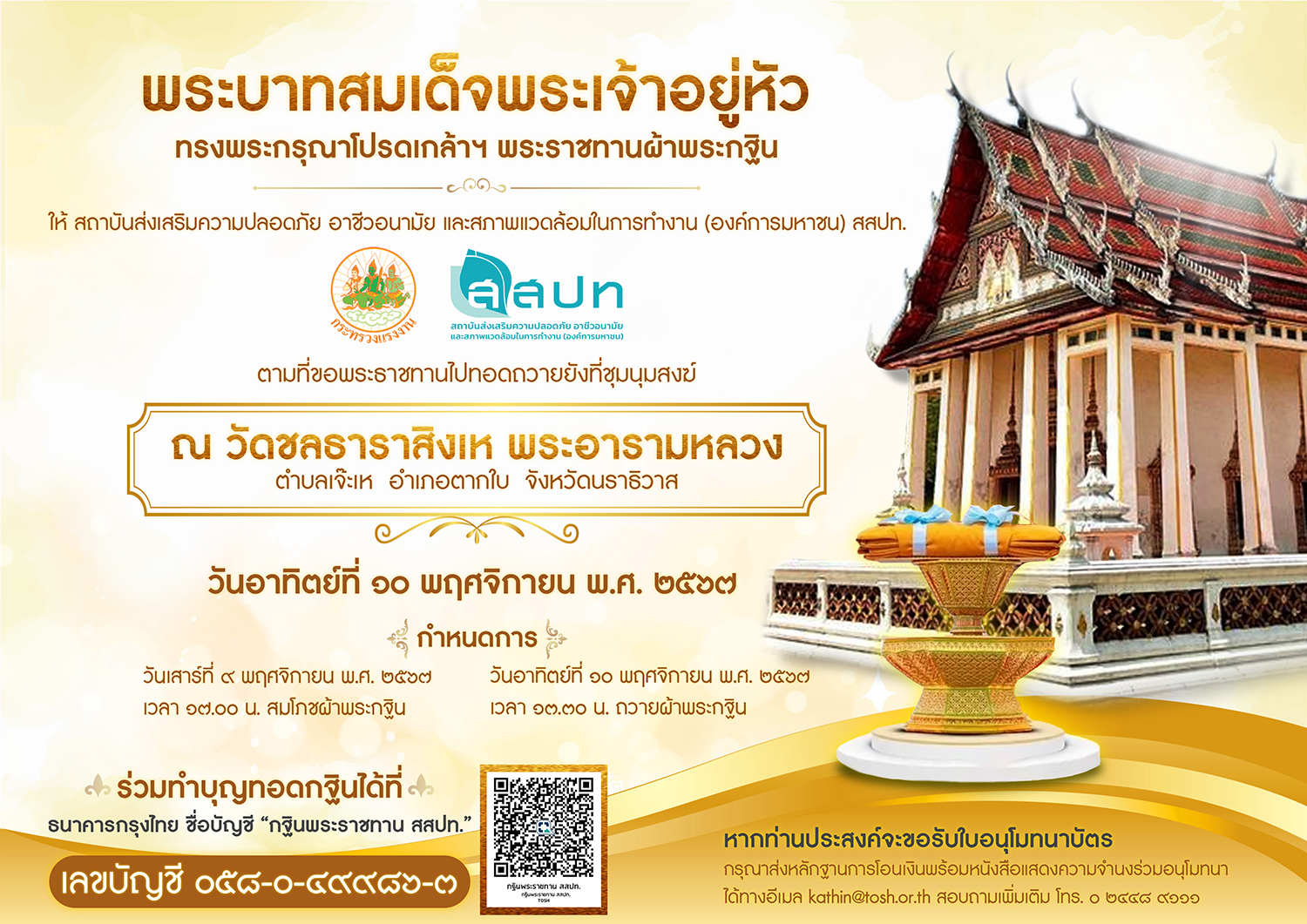 ถวายผ้าพระกฐินพระราชทานของสถาบันส่งเสริมความปลอดภัย อาชีวอนามัย และสภาพแวดล้อมในการทำงาน (องค์การมหาชน) ประจำปี 2567