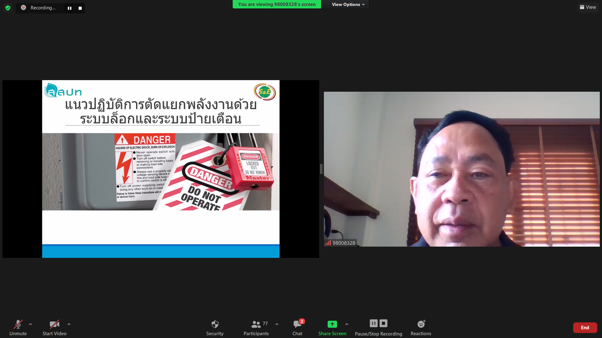 เมื่อวันที่ 13 มกราคม 2565 สถาบันส่งเสริมความปลอดภัย อาชีวอนามัย และสภาพแวดล้อมในการทำงาน (องค์การมหาชน) จัดสัมมนาหัวข้อ : แนวปฏิบัติระบบตัดแยกพลังงานด้วยระบบล็อกและระบบป้ายเตือน (Log Out/Tag Out) รุ่นที่ 1 ในรูปแบบออนไลน์ผ่านโปรแกรม ZOOM Meeting เพื่อส่งเสริมและพัฒนาการเรียนรู้ด้านความปลอดภัย อาชีวอนามัย และสร้างความตระหนักให้เกิดจิตสำนึกในด้านความปลอดภัยให้แก่เจ้าหน้าที่ความปลอดภัยในการทำงานทุกระดับ นายจ้าง ลูกจ้าง ในสถานประกอบกิจการ สามารถนำองค์ความรู้ไปขยายผล ปรับปรุง พัฒนา เพื่อให้เกิดความปปลอดภัยในการทำงานอย่างเป็นรูปธรรม ซึ่งได้รับเกียรติจาก นายสุรชัย วิวัจนสิรินทร์ ที่ปรึกษาด้านความปลอดภัยฯ การจัดการกระบวนการผลิต (Process System Management) เป็นวิทยากร โดยมีผู้เข้าสัมมนา จำนวน 118 คน