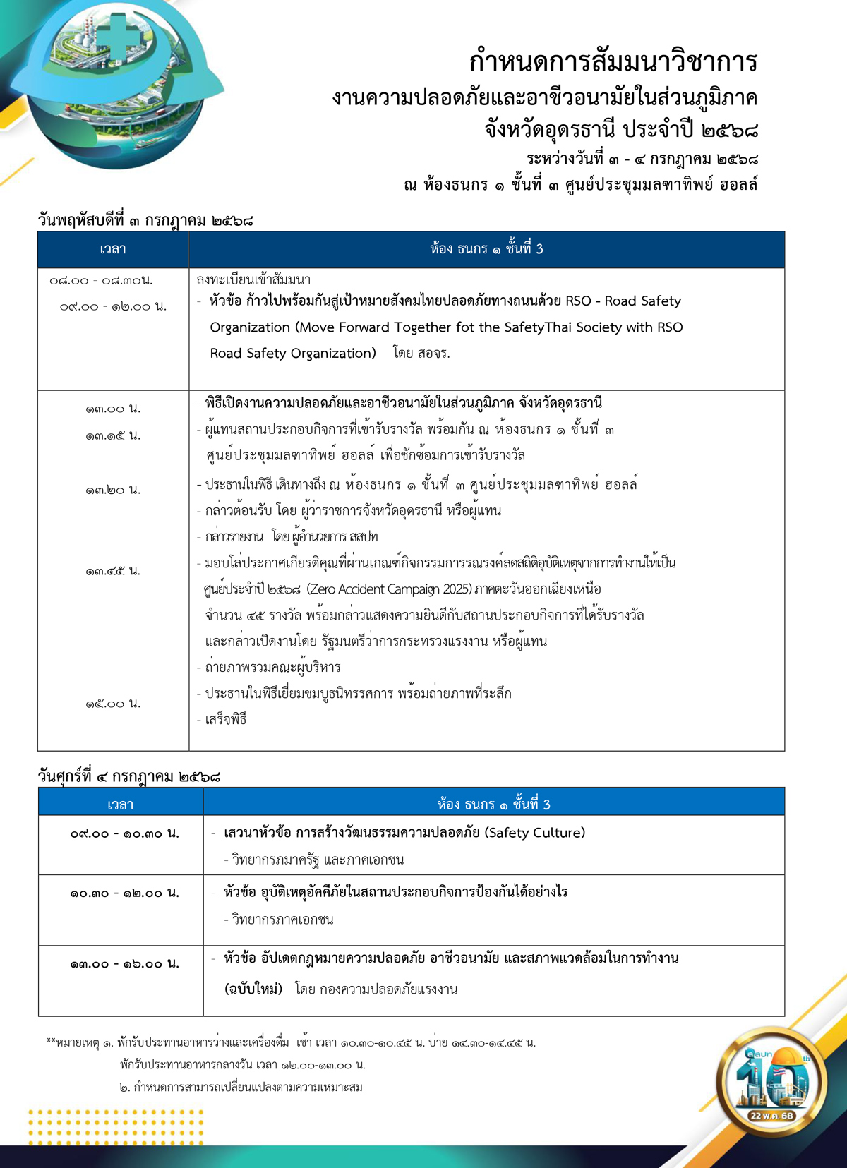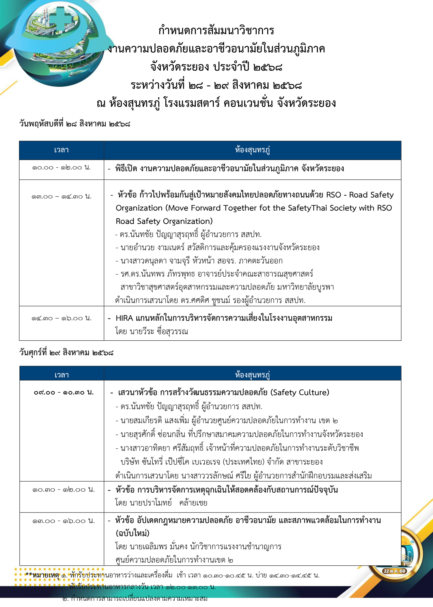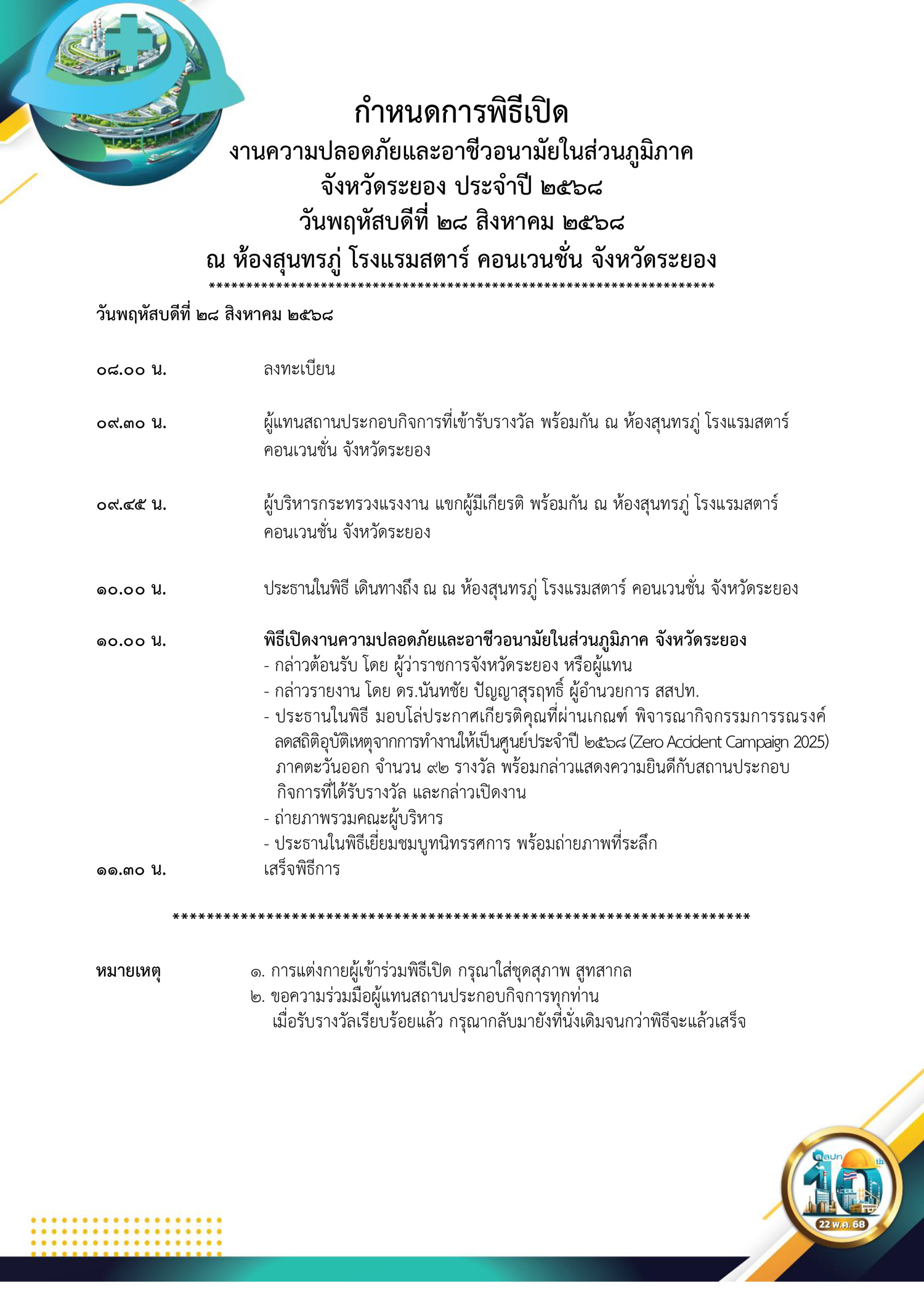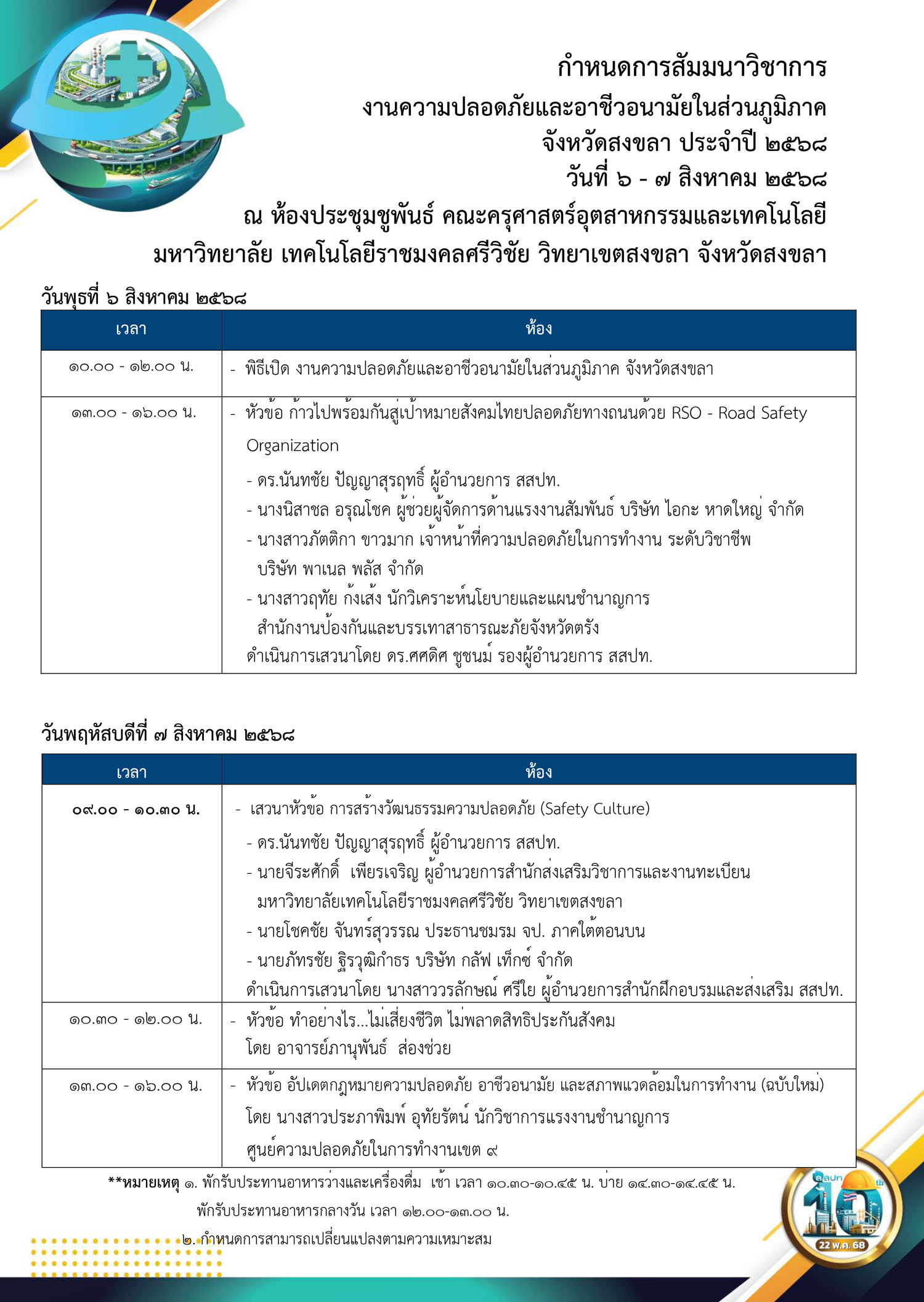 สถาบันส่งเสริมความปลอดภัย อาชีวอนามัย และสภาพแวดล้อมในการทำงาน (องค์การมหาชน) ร่วมกับภาคีเครือข่ายด้านความปลอดภัย กำหนดจัดงานความปลอดภัยและอาชีวอนามัยในส่วนภูมิภาค ประจำปี 2568 จำนวน 4 ภาค เพื่อให้นายจ้าง ลูกจ้าง ผู้ที่เกี่ยวข้องทั้งภาครัฐ และภาคเอกชน ตระหนักถึงความสำคัญในเรื่องความปลอดภัย อาชีวอนามัย และสภาพแวดล้อมในการทำงาน รวมทั้งเพื่อพัฒนาศักยภาพบุคลากรด้านความปลอดภัยในการทำงานของสถานประกอบกิจการ ภายใต้แนวคิด ร่วมสร้างวัฒนธรรมไทยเชิงป้องกัน สู่ความปลอดภัย อาชีวอนามัย และความผาสุกที่ยั่งยืน (Forward Culture of Prevention for Safety Thailand) โดยงานดังกล่าวจัดให้มีการสัมมนาวิชาการ การแสดงนิทรรศการจากภาครัฐและเอกชน กิจกรรมแลกเปลี่ยนเรียนรู้ด้านความปลอดภัย เพื่อเสริมสร้างการพัฒนาองค์ความรู้และประสบการณ์ทางวิชาการให้กับผู้เข้าร่วมงาน
