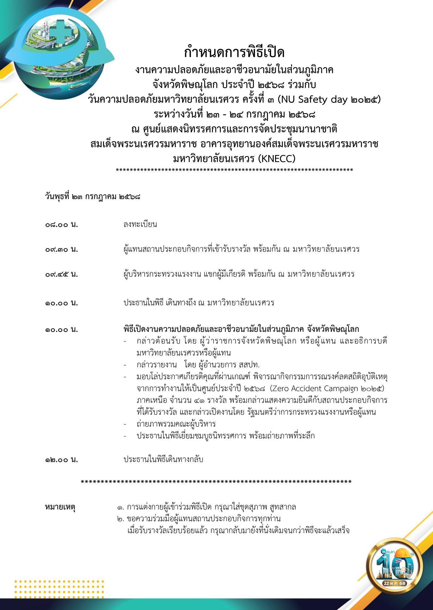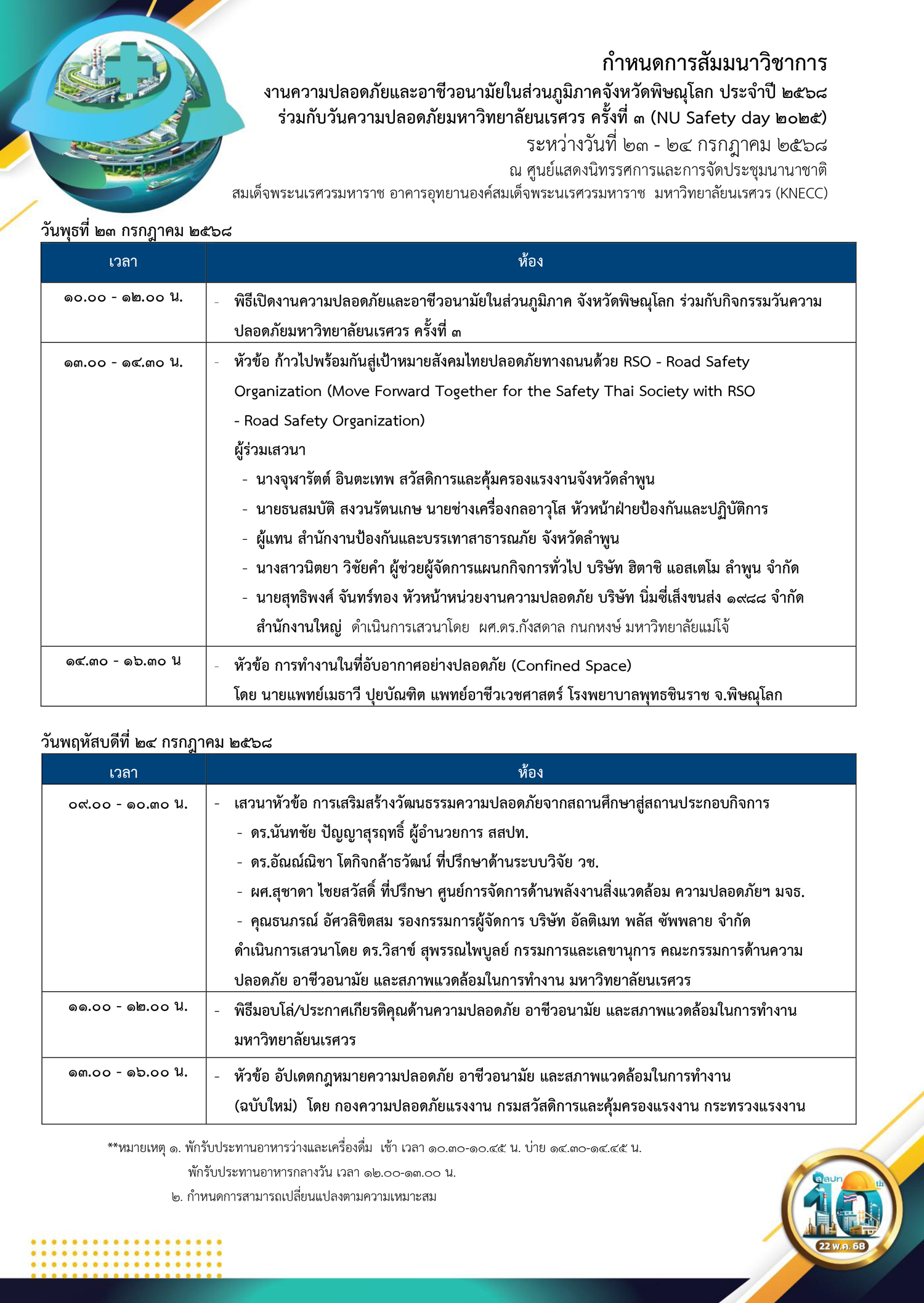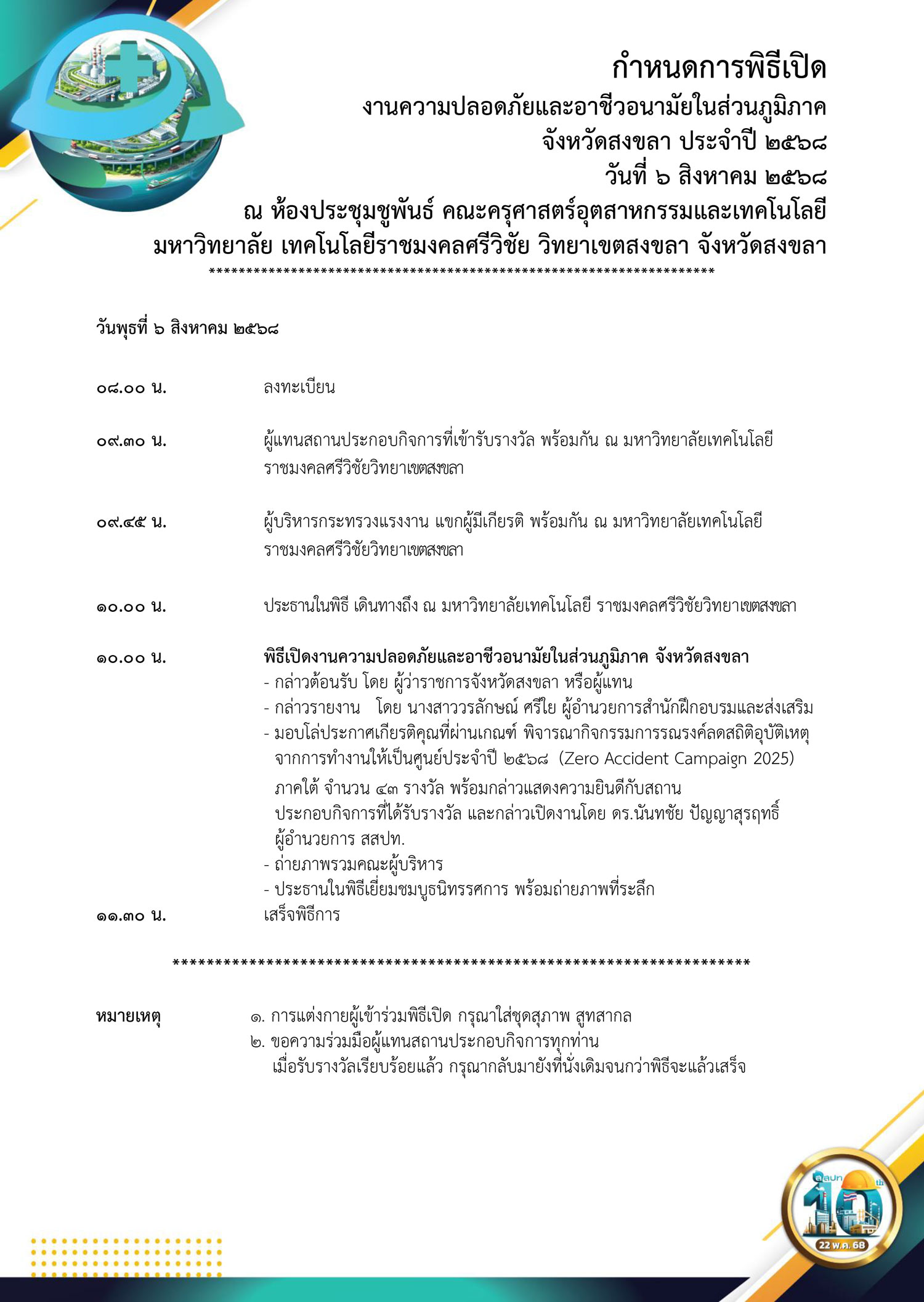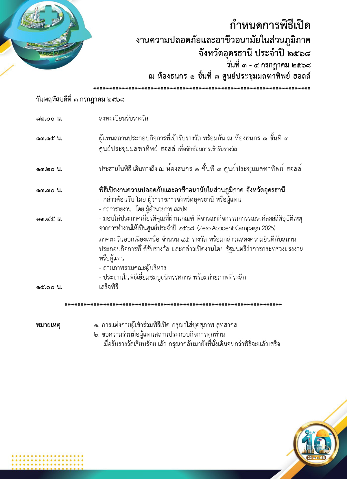สถาบันส่งเสริมความปลอดภัย อาชีวอนามัย และสภาพแวดล้อมในการทำงาน (องค์การมหาชน) ร่วมกับภาคีเครือข่ายด้านความปลอดภัย กำหนดจัดงานความปลอดภัยและอาชีวอนามัยในส่วนภูมิภาค ประจำปี 2568 จำนวน 4 ภาค เพื่อให้นายจ้าง ลูกจ้าง ผู้ที่เกี่ยวข้องทั้งภาครัฐ และภาคเอกชน ตระหนักถึงความสำคัญในเรื่องความปลอดภัย อาชีวอนามัย และสภาพแวดล้อมในการทำงาน รวมทั้งเพื่อพัฒนาศักยภาพบุคลากรด้านความปลอดภัยในการทำงานของสถานประกอบกิจการ ภายใต้แนวคิด ร่วมสร้างวัฒนธรรมไทยเชิงป้องกัน สู่ความปลอดภัย อาชีวอนามัย และความผาสุกที่ยั่งยืน (Forward Culture of Prevention for Safety Thailand) โดยงานดังกล่าวจัดให้มีการสัมมนาวิชาการ การแสดงนิทรรศการจากภาครัฐและเอกชน กิจกรรมแลกเปลี่ยนเรียนรู้ด้านความปลอดภัย เพื่อเสริมสร้างการพัฒนาองค์ความรู้และประสบการณ์ทางวิชาการให้กับผู้เข้าร่วมงาน