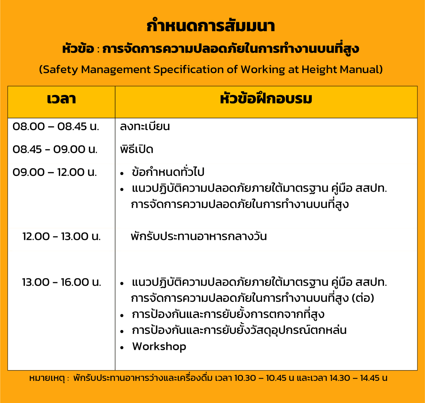 สถาบันส่งเสริมความปลอดภัย อาชีวอนามัยและสภาพแวดล้อมในการทำงาน (องค์การมหาชน) กำหนดจัดสัมมนา หัวข้อ การจัดการความปลอดภัยในการทำงานบนที่สูง (Safety Management Specification of Working at Height Manual) เพื่อส่งเสริมความรู้ความเข้าใจเกี่ยวกับการจัดการความปลอดภัยในการทำงานบนที่สูง มุ่งหวังให้สถานประกอบกิจการเกิดแนวทางการบริหารจัดการความปลอดภัยที่ชัดเจน  นำไปสู่การปฏิบัติที่มีประสิทธิภาพ ลดความเสี่ยงต่อการเกิดอุบัติเหตุจากการตกจากที่สูง ให้เป็นไปตามข้อกำหนด กฎหมาย และมาตรฐานที่เกี่ยวข้องต่อไป