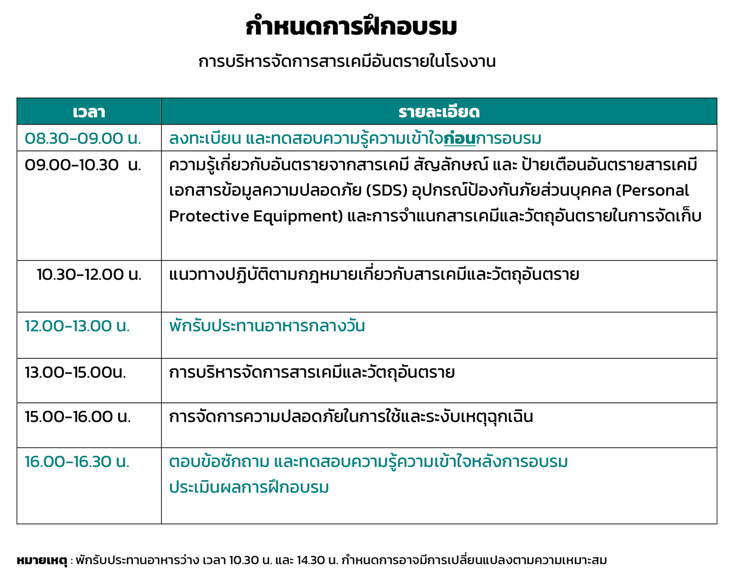 • เพื่อเสริมสร้างทักษะในการจัดการสารเคมีอย่างถูกต้องและปลอดภัยตามหลักกฎหมาย