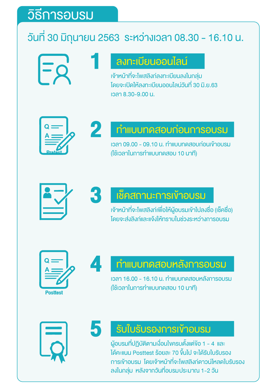 - ผู้เข้าอบรมที่ปฏิบัติตามเงื่อนไขวิธีการอบรมที่กำหนด จะได้รับใบรับรองการเข้าอบรมในรูปแบบไฟล์อิเล็กทรอนิกส์ หลังจากเสร็จสิ้นการอบรมแล้วประมาณ 1-2 วัน โดยต้องปฏิบัติตามวิธีการอบรม ดังนี้