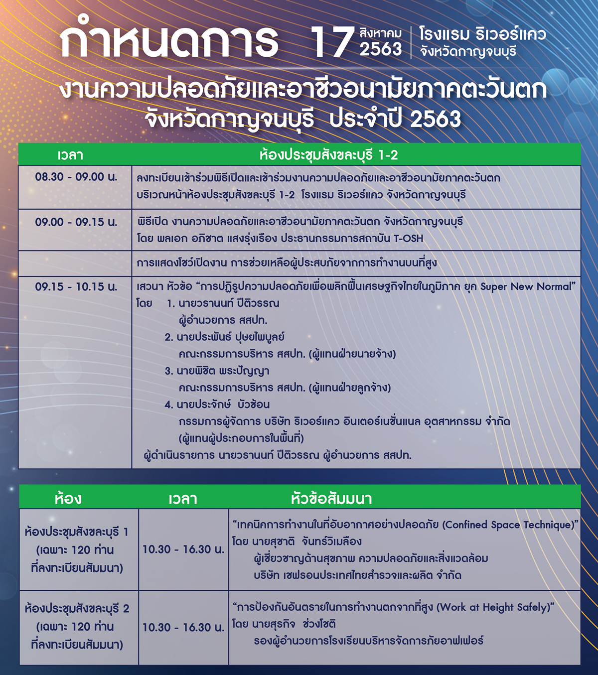สถาบันส่งเสริมความปลอดภัย อาชีวอนามัย และสภาพแวดล้อมในการทำงาน (องค์การมหาชน) T-OSH ร่วมกับสำนักงานสวัสดิการและคุ้มครองแรงงานจังหวัดกาญจนบุรี ศูนย์ความปลอดภัยในการทำงานเขต 7 (จ.ราชบุรี) ชมรมเจ้าหน้าที่ความปลอดภัยในการทำงานภาคตะวันตก ชมรมเจ้าหน้าที่ความปลอดภัยในการทำงานจังหวัดกาญจนบุรี และเครือข่ายความปลอดภัยภาคตะวันตก กำหนดจัดงานความปลอดภัยและอาชีวอนามัยภาคตะวันตก จังหวัดกาญจนบุรี ประจำปี 2563 วันที่ 17 สิงหาคม 2563 ณ โรงแรม ริเวอร์แคว จังหวัดกาญจนบุรี ภายใต้ธีมงาน “Forward Culture of Prevention for Safety Thailand 2020 มุ่งสร้างสรรค์วัฒนธรรมไทยเชิงป้องกัน สู่ความปลอดภัย อาชีวอนามัย และความผาสุกที่ยั่งยืน ปี 2563” ซึ่งภายในงานกำหนดให้มีการสัมมนาวิชาการและนิทรรศการด้านความปลอดภัยฯ