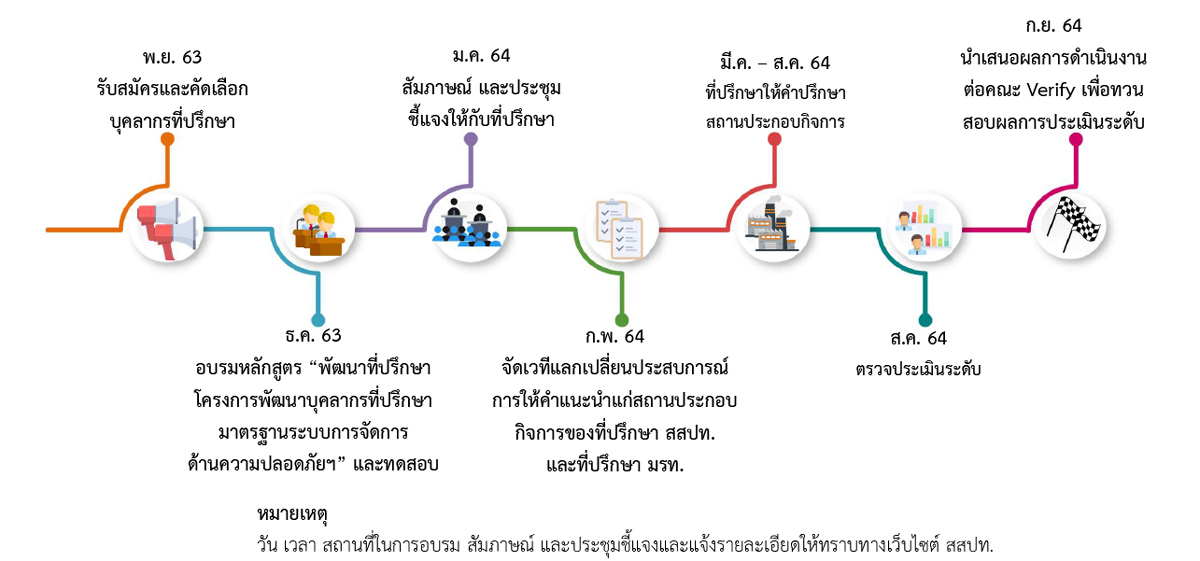 สถาบันส่งเสริมความปลอดภัยฯ จึงได้จัดทำโครงการพัฒนาบุคลากรที่ปรึกษามาตรฐานระบบการจัดการด้านความปลอดภัย อาชีวอนามัย และสภาพแวดล้อมในการทำงาน อย่างต่อเนื่องทุกปี ให้เพียงพอต่อกลุ่มเป้าหมายในการให้คำปรึกษา แนะนำ สถานประกอบกิจการในการจัดทำมาตรฐานระบบการจัดการความปลอดภัยฯ และเป็นการสร้างเครือข่ายบุคลากรด้านความปลอดภัยฯ จากหลากหลายอาชีพ เช่น เจ้าหน้าที่ความปลอดภัยในการทำงาน ที่ปรึกษาอิสระ รวมถึงที่ปรึกษามาตรฐานแรงงานไทย เป็นต้น