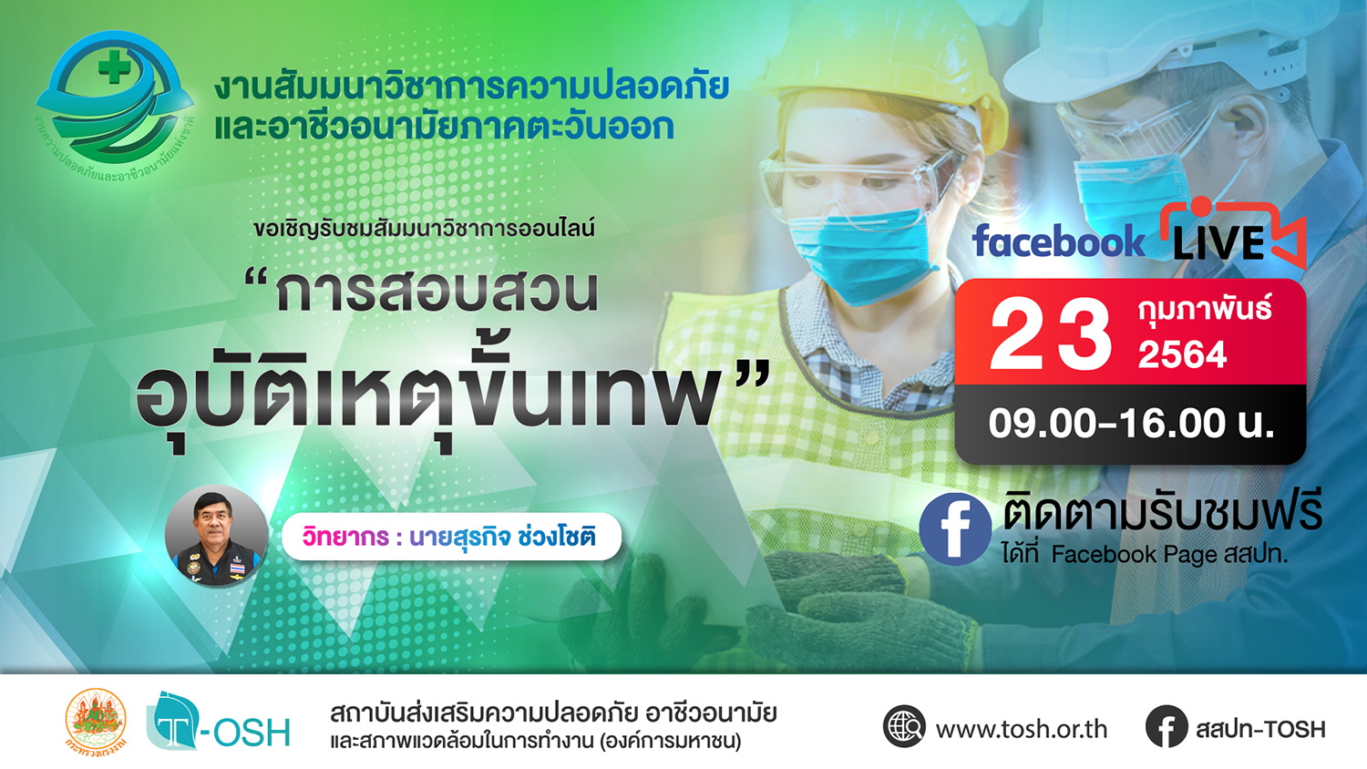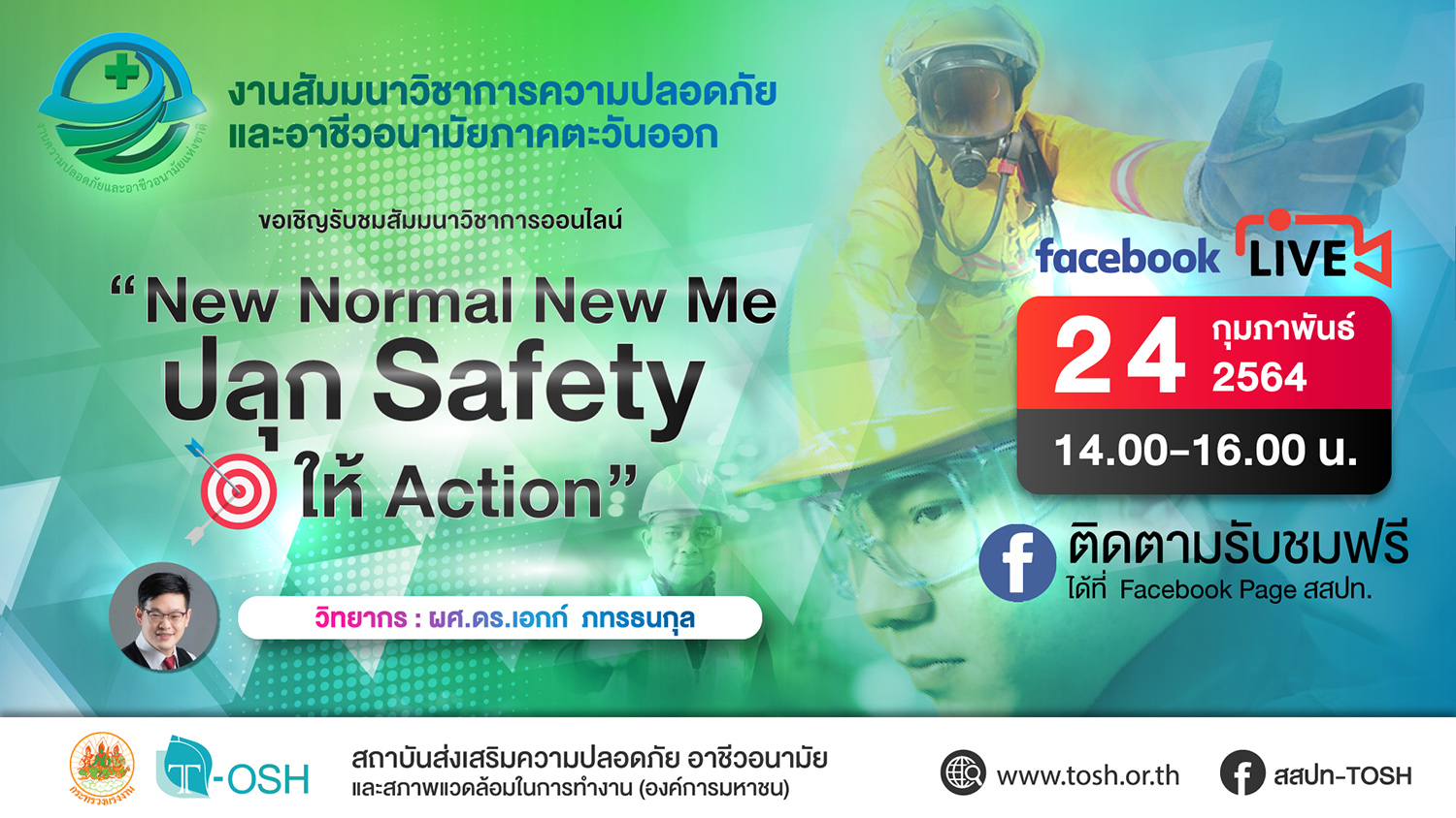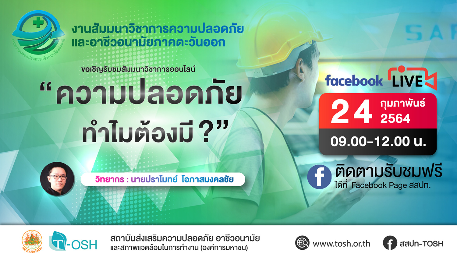 สถาบันส่งเสริมความปลอดภัย อาชีวอนามัย และสภาพแวดล้อมในการทำงาน (องค์การมหาชน) กำหนดจัดงานสัมมนาวิชาการความปลอดภัยและอาชีวอนามัยภาคตะวันออก ระหว่างวันที่ 23-24 กุมภาพันธ์ 2564 และเนื่องด้วยปัจจุบันสถานการณ์การแพร่ระบาดของโรคติดเชื้อไวรัสโคโรนา (COVID-19) ยังน่าเป็นห่วงและต้องเฝ้าระวังอย่างต่อเนื่อง จึงได้พิจารณาจัดงานให้เหมาะสมกับสถานการณ์ปัจจุบัน โดยใช้รูปแบบการจัดงานสัมมนาวิชาการในรูปแบบออนไลน์แทน สถาบันฯ จึงขอเรียนเชิญสถานประกอบกิจการหรือหน่วยงานเข้าร่วมสัมมนาวิชาการออนไลน์ เพื่อเพิ่มพูนความรู้ในเรื่องความปลอดภัย อาชีวอนามัย และสภาพแวดล้อมในการทำงาน ทั้งนี้ท่านสามารถรับชมการถ่ายทอดสดการสัมมนาผ่านทาง Facebook Live เพจ สสปท. ฟรี ในวันและเวลาตามกำหนดการด้านล่างนี้