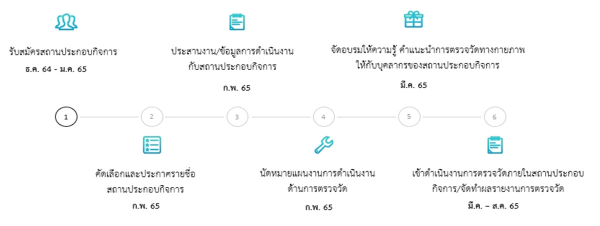 - สสปท. จะประกาศรายชื่อสถานประกอบกิจการที่ผ่านการคัดเลือกภายในวันที่ 4 กุมภาพันธ์ 2565 และกำหนดแผนการดำเนินงานร่วมกับสถานประกอบกิจการต่อไป