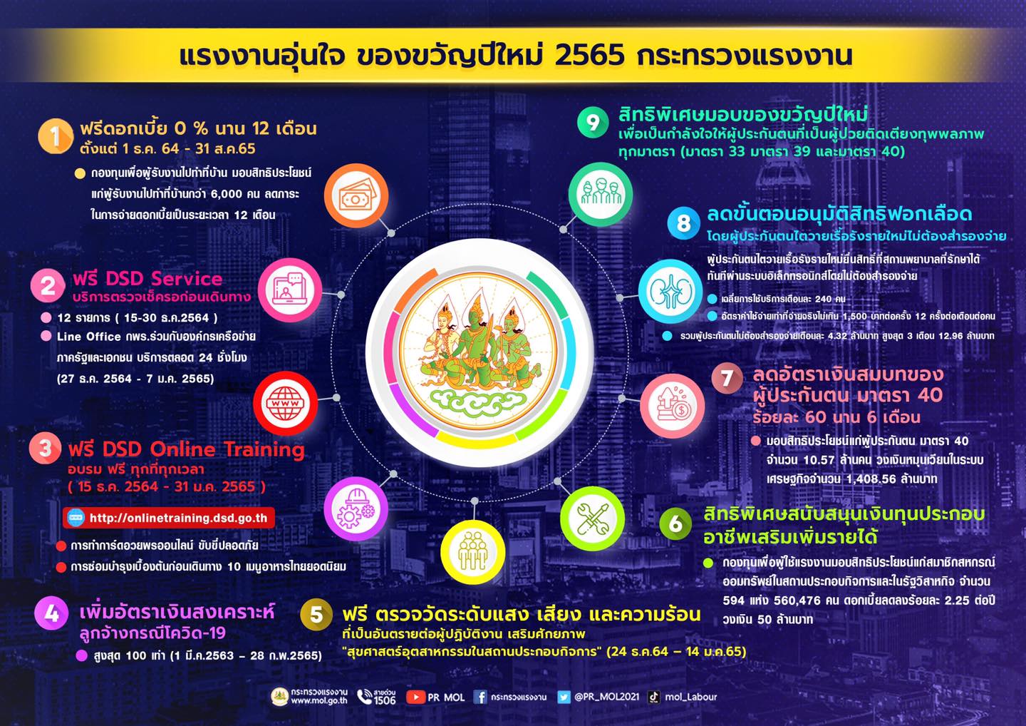 ด้วยรัฐบาลตระหนักถึงความสำคัญของแรงงาน ซึ่งเป็นทรัพยากรมนุษย์ที่มีคุณค่าและมีส่วนในการพัฒนาประเทศในทุกระดับ เพื่อให้สอดคล้องกับยุทธศาสตร์ของรัฐบาล ประกอบกับรัฐมนตรีว่าการกระทรวงแรงงานได้ประกาศนโยบายกระทรวงแรงงาน ปี 2565 “สืบสาน รักษา ต่อยอด MOL พลิกโฉมตลาดแรงงานไทย” สสปท. มีความยินดีที่จะให้บริการตรวจวัดระดับแสง เสียง และความร้อน ที่เป็นอันตรายต่อผู้ปฏิบัติงาน เพื่อมอบเป็นของขวัญปีใหม่ และเพื่อเป็นการส่งเสริม สนับสนุน พัฒนาศักยภาพของบุคลากรในสถานประกอบกิจการให้สามารถดำเนินงานด้านความปลอดภัย อาชีวอนามัย และสภาพแวดล้อมในการทำงาน และเผยแพร่องค์ความรู้ด้านสุขศาสตร์อุตสาหกรรมอย่างต่อเนื่อง