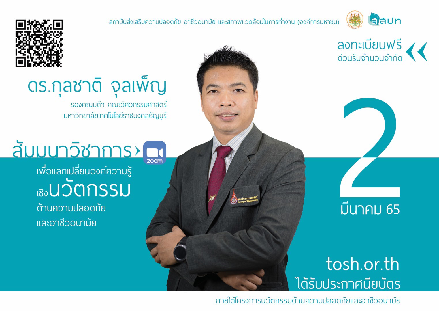 สถาบันส่งเสริมความปลอดภัย อาชีวอนามัย และสภาพแวดล้อมในการทำงาน (องค์การมหาชน) ขอเชิญสถานประกอบกิจการ หรือผู้ที่สนใจ เข้าร่วมสัมมนาวิชาการเพื่อแลกเปลี่ยนองค์ความรู้เชิงนวัตกรรมด้านความปลอดภัยและอาชีวอนามัย ผ่านการสัมมนาออนไลน์ระบบ Zoom ในวันพุธที่ 2 มีนาคม 2565 ซึ่งหลังการสัมมนาแล้วจะได้รับใบประกาศนียบัตรภายใต้โครงการพัฒนานวัตกรรมด้านความปลอดภัยและอาชีวอนามัย ลงทะเบียนสมัครฟรีไม่มีค่าใช้จ่าย หมดเขตรับสมัครวันที่ 28 กุมภาพันธ์ 2565