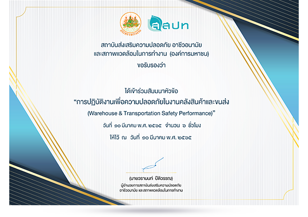 สถาบันส่งเสริมความปลอดภัย อาชีวอนามัย และสภาพแวดล้อมในการทำงาน (องค์การมหาชน) กำหนดจัดสัมมนาหัวข้อ : การปฏิบัติงานเพื่อความปลอดภัยในงานคลังสินค้าและขนส่ง (Warehouse & Transportation Safety Performance) เพื่อส่งเสริมและพัฒนาการเรียนรู้ด้านความปลอดภัย อาชีวอนามัย และสร้างความตระหนักให้เกิดจิตสำนึกในด้านความปลอดภัยให้แก่เจ้าหน้าที่ความปลอดภัยในการทำงานทุกระดับ นายจ้าง ลูกจ้าง หรือผู้ที่ทำงานด้านคลังสินค้าและขนส่งในสถานประกอบกิจการ สามารถนำองค์ความรู้ที่ได้ไปขยายผล ปรับปรุง พัฒนา เพื่อให้เกิดความปปลอดภัยในการทำงานอย่างเป็นรูปธรรม สถาบันฯ จึงขอเชิญชวนสถานประกอบกิจการที่อยู่ในพื้นที่จังหวัดนครสวรรค์และใกล้เคียง สมัครเข้าร่วมการสัมมนาในหัวข้อดังกล่าวโดยไม่เสียค่าใช้จ่าย ทั้งนี้ผู้เข้าสัมมนาจะได้รับใบประกาศนียบัตรอิเล็กทรอนิกส์เมื่อเสร็จสิ้นการสัมมนา