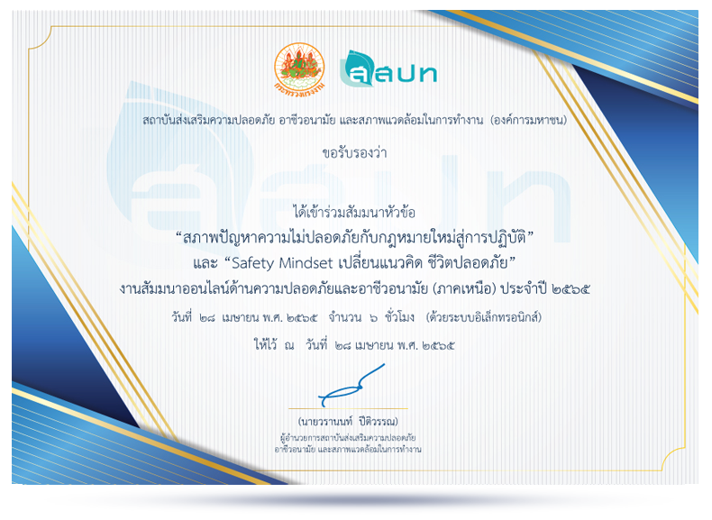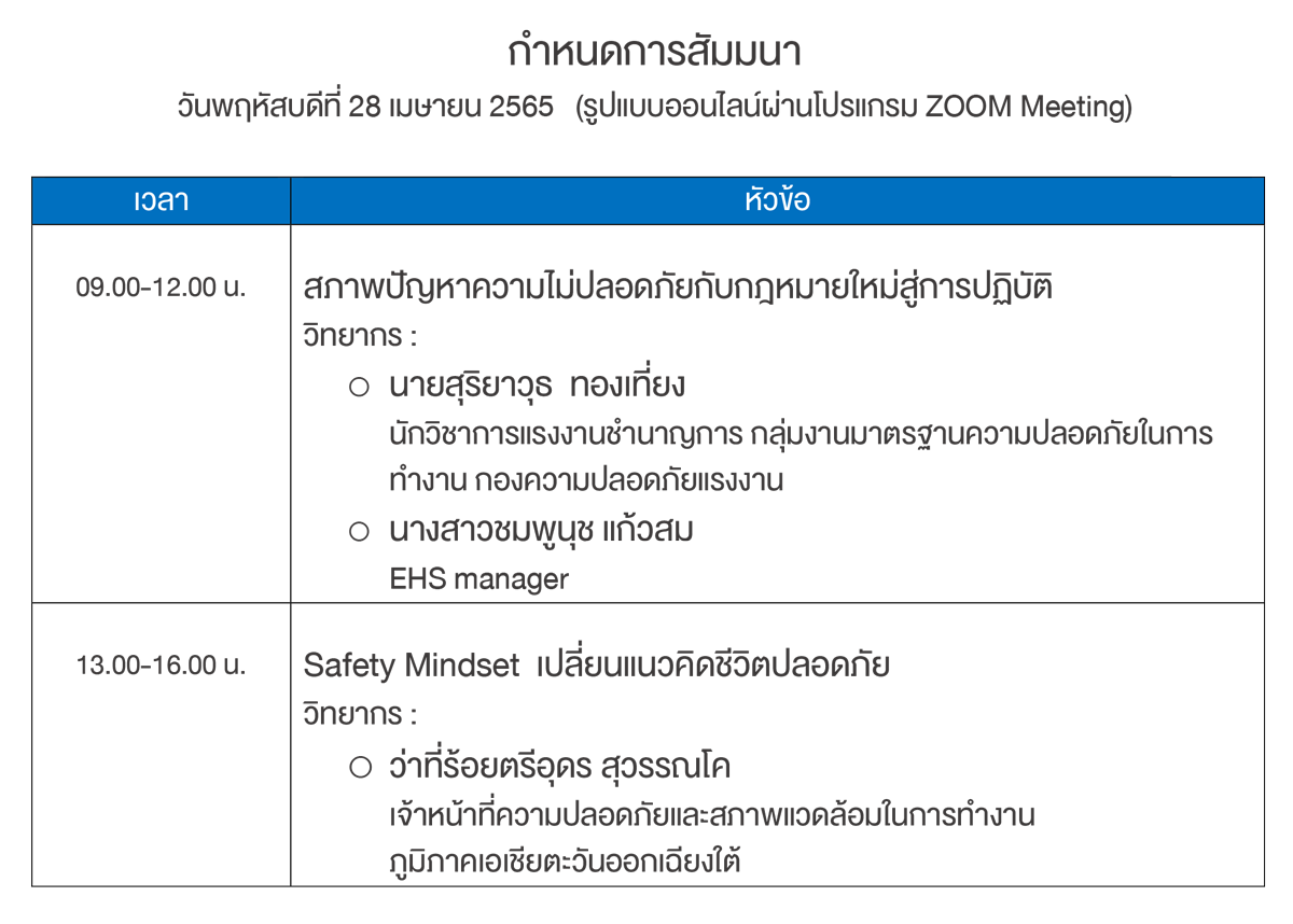 สถาบันส่งเสริมความปลอดภัย อาชีวอนามัย และสภาพแวดล้อมในการทำงาน (องค์การมหาชน) ร่วมกับกรมสวัสดิการและคุ้มครองแรงงาน กำหนดจัดงานสัมมนาออนไลน์ด้านความปลอดภัยและอาชีวอนามัย (ภาคเหนือ) วันที่ 28 เมษายน 2565 ในรูปแบบออนไลน์ผ่านโปรแกรม ZOOM Meeting จึงขอเชิญชวนภาคีเครือข่าย นายจ้าง ลูกจ้าง สถานประกอบกิจการ และหน่วยงาน หรือผู้สนใจทั่วไปในเขตภาคเหนือ สมัครเข้าร่วมสัมมนาออนไลน์ (ฟรีไม่มีค่าใช้จ่าย) โดยเมื่อเสร็จสิ้นการสัมมนาท่านจะได้รับใบประกาศนียบัตรออนไลน์ รับสมัครจำนวนจำกัด 300 คนเท่านั้น