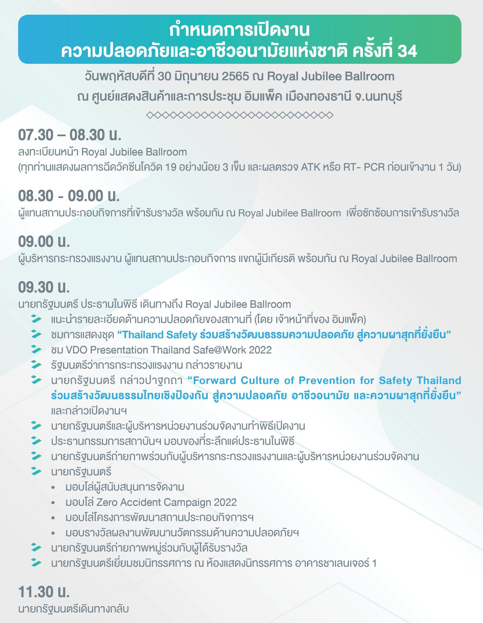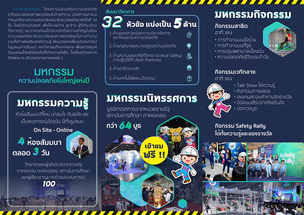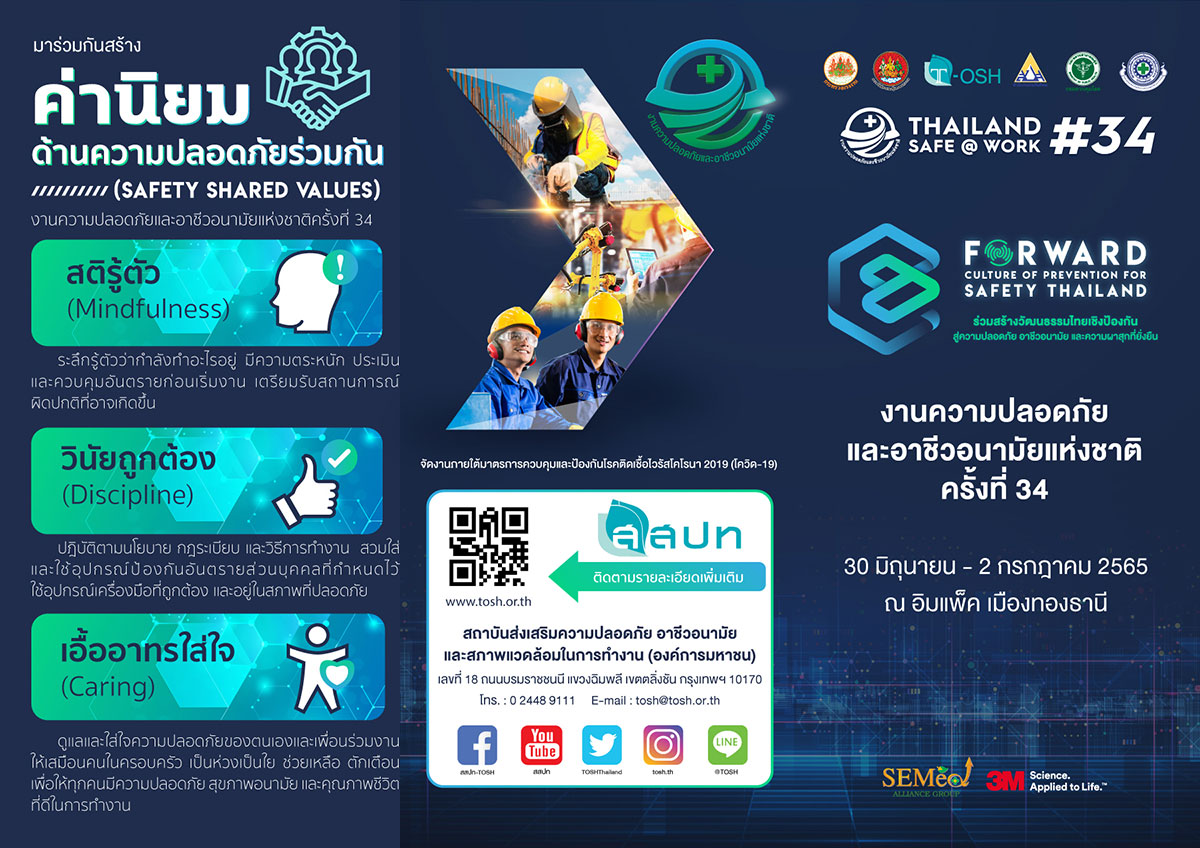 กระทรวงแรงงาน โดยสถาบันส่งเสริมความปลอดภัย อาชีวอนามัย และสภาพแวดล้อมในการทำงาน (องค์การมหาชน) กำหนดจัดงานความปลอดภัยและอาชีวอนามัยแห่งชาติ ครั้งที่ 34 ขึ้นระหว่างวันที่ 30 มิถุนายน -2 กรกฎาคม 2565 ณ ศูนย์แสดงสินค้าและการประชุมอิมแพ็ค เมืองทองธานี มีวัตถุประสงค์เพื่อให้นายจ้าง ลูกจ้าง ผู้ที่เกี่ยวข้องทั้งภาครัฐ และภาคเอกชน ตระหนักถึงความสำคัญในเรื่องความปลอดภัย อาชีวอนามัย และสภาพแวดล้อมในการทำงาน ภายใต้แนวคิด ร่วมสร้างวัฒนธรรมไทยเชิงป้องกัน สู่ความปลอดภัย อาชีวอนามัย และความผาสุกที่ยั่งยืน (Forward Culture of Prevention for Safety Thailand) โดยงานดังกล่าวจัดให้มีการสัมมนาวิชาการ การแสดงนิทรรศการและการสาธิตด้านความปลอดภัยในการทำงาน รวมทั้งกิจกรรมการประกวดและสาระบันเทิงด้านความปลอดภัยในการทำงาน เพื่อให้กลุ่มบุคคล และองค์กรที่เกี่ยวข้อง ได้มีโอกาสในการพัฒนาแลกเปลี่ยนเรียนรู้ ประสบการณ์ทางวิชาการ แนวคิดและวิธีการแก้ไขปัญหา เพื่อการสร้างสรรค์วัฒนธรรมไทยเชิงป้องกัน สู่ความปลอดภัย อาชีวอนามัย และความผาสุกที่ยั่งยืน (จัดงานภายใต้มาตรการควบคุมและป้องกันการแพร่ระบาดของโรคติดเชื้อไวรัสโคโรนา 2019 ของกระทรวงสาธารณสุข) โดยโซนนิทรรศการ จัดขึ้นบริเวณอาคารชาเลนเจอร์ 1