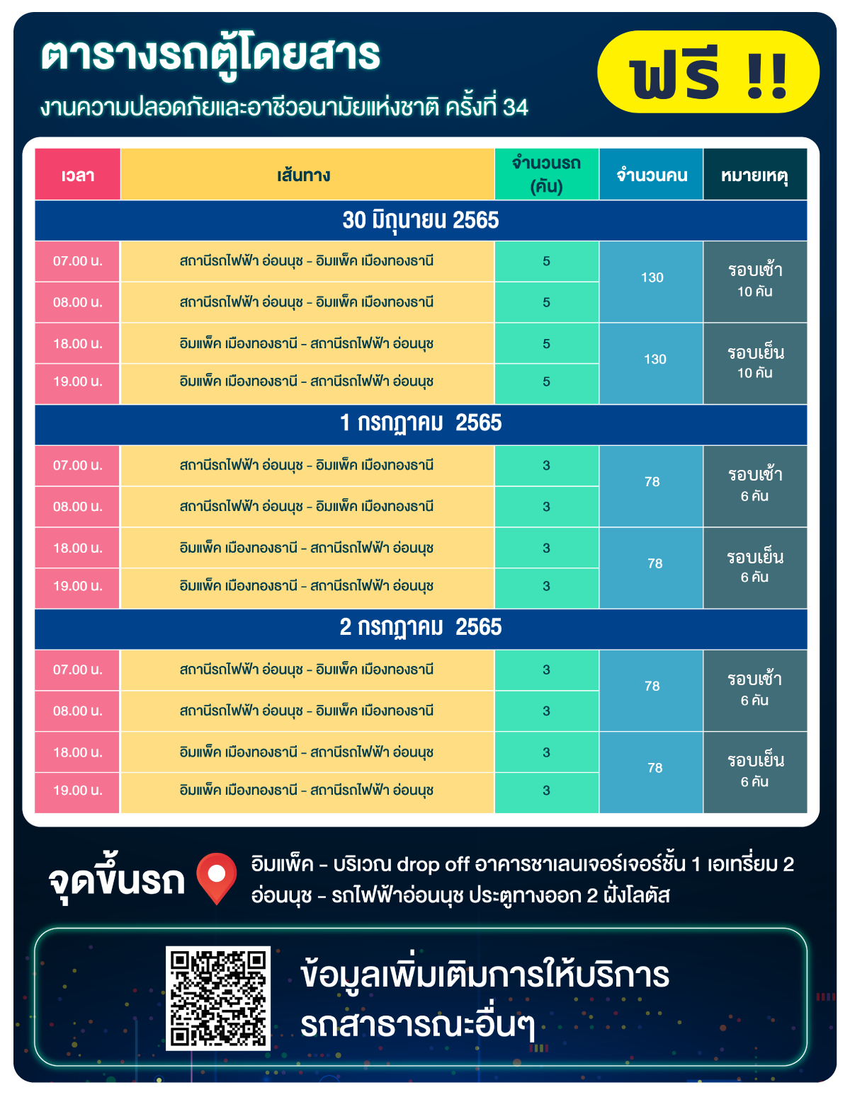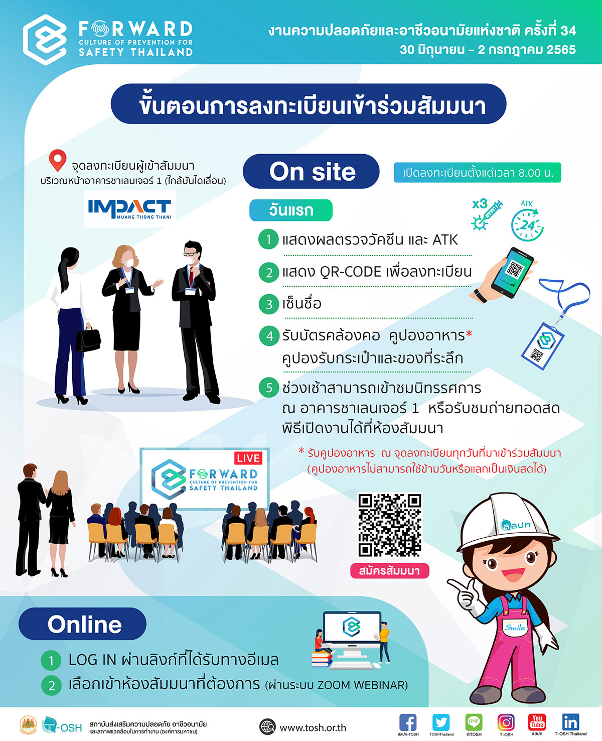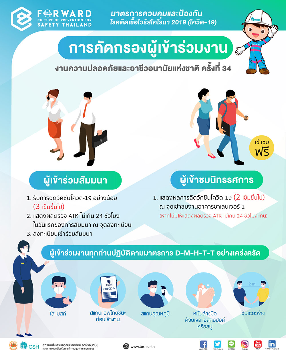 สถาบันส่งเสริมความปลอดภัยฯ จึงขอเชิญผู้บริหารหน่วยงาน นายจ้าง ลูกจ้าง เจ้าของสถานประกอบกิจการ วิศวกร แพทย์/พยาบาลประจำสถานประกอบกิจการ เจ้าหน้าที่ความปลอดภัยในการทำงานทุกระดับ รวมทั้งสถาบันการศึกษา หน่วยงานภาครัฐ และผู้ที่สนใจ เข้าร่วมชมนิทรรศการฟรี และสมัครเข้าร่วมสัมมนาวิชาการ (จัดรูปแบบ On Site และ Online) ทั้งนี้ผู้เข้าร่วมสัมมนา (On Site) ต้องได้รับการฉีดวัคซีนโควิด-19 แล้วอย่างน้อย 3 เข็ม และต้องแสดงผลหรือภาพถ่ายการตรวจ ATK ไม่เกิน 24 ชั่วโมง ในวันแรกของการสัมมนา ณ จุดลงทะเบียน