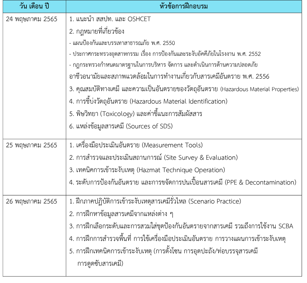 สถาบันส่งเสริมความปลอดภัย อาชีวอนามัย และสภาพแวดล้อมในการทำงาน (องค์การมหาชน) โดย ศูนย์ส่งเสริมความปลอดภัยและอาชีวอนามัยภูมิภาคตะวันออก (Occupational Safety and Health Center in Eastern Thailand : OSHCET) กำหนดจัดฝึกอบรม : "นักตอบโต้เหตุฉุกเฉินจากสารเคมีอันตรายรั่วไหล" จัดขึ้นเพื่อให้มีหลักสูตรมาตรฐานของการฝึกอบรมนักตอบโต้เหตุฉุกเฉินจากสารเคมีอันตรายรั่วไหล และเพิ่มจำนวนนักตอบโต้เหตุฉุกเฉินจากสารเคมีอันตรายรั่วไหลที่มีความรู้และทักษะระดับมาตรฐานสากล โดยเป็นการฝึกอบรมทั้งภาคทฤษฎีและปฏิบัติเป็นเวลา 3 วัน สถาบันฯ จึงขอเชิญชวนเจ้าหน้าที่ความปลอดภัยระดับวิชาชีพที่อยู่ในพื้นที่จังหวัดระยอง สมัครเข้าร่วมอบรมดังกล่าวโดยไม่เสียค่าใช้จ่าย ทั้งนี้ผู้เข้าอบรมจะได้รับใบประกาศนียบัตรเมื่อเสร็จสิ้นการอบรม (รับสมัครจำนวนจำกัด 20 คน)