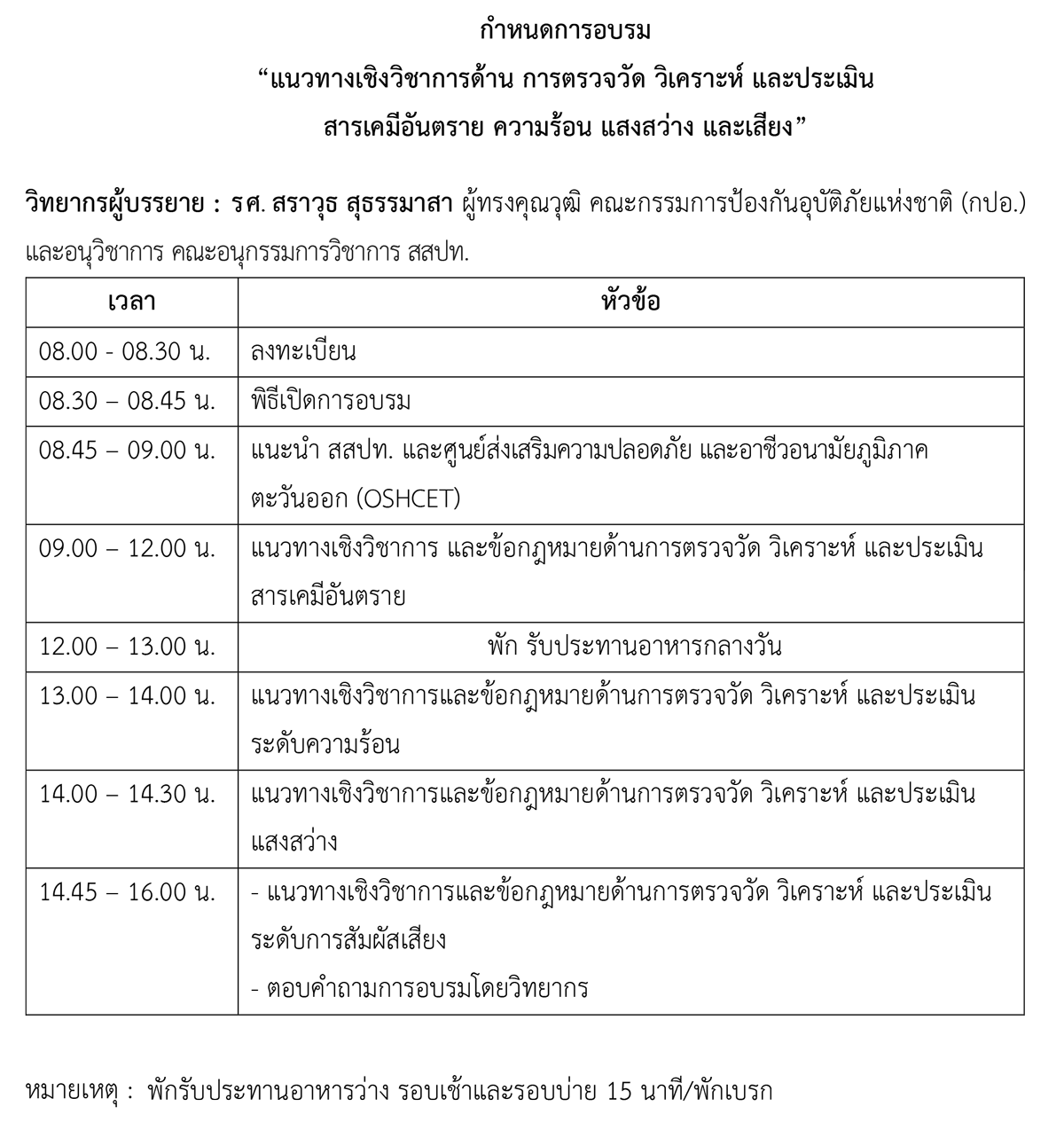 สถาบันส่งเสริมความปลอดภัย อาชีวอนามัย และสภาพแวดล้อมในการทำงาน (องค์การมหาชน) หรือ สสปท. ได้จัดทำโครงการส่งเสริมความปลอดภัยและอาชีวอนามัยภูมิภาคตะวันออก โดยเน้นการให้บริการด้านความปลอดภัยฯ ในพื้นที่ภาคตะวันออก ซึ่งปี 2565 ศูนย์ประสานงานและเตรียมความพร้อมในการขับเคลื่อนภารกิจการส่งเสริมความปลอดภัย และอาชีวอนามัยภูมิภาคตะวันออก (Occupational Safety and Health Center in Eastern Thailand : OSHCET) กำหนดจัดอบรม “แนวทางเชิงวิชาการด้านการตรวจวัด วิเคราะห์ และประเมิน สารเคมีอันตราย ความร้อน แสงสว่าง และเสียง” รุ่นที่ 2 และ 3 ในรูปแบบ On Site และในรูปแบบออนไลน์ (Zoom Meeting) เพื่อถ่ายทอดองค์ความรู้ และพัฒนาศักยภาพบุคลากร ผู้ใช้แรงงานด้านความปลอดภัยนำไปสู่การลดการประสบอันตรายจากการทำงาน สสปท. จึงขอเชิญชวนบุคลากรด้านความปลอดภัยของสถานประกอบกิจการและหน่วยงานที่เกี่ยวข้องในพื้นที่ๆ กำหนดในแต่ละรุ่นสมัครเข้าร่วมการฝึกอบรมฯ (สมัครฟรี ได้รับใบประกาศนียบัตรออนไลน์)