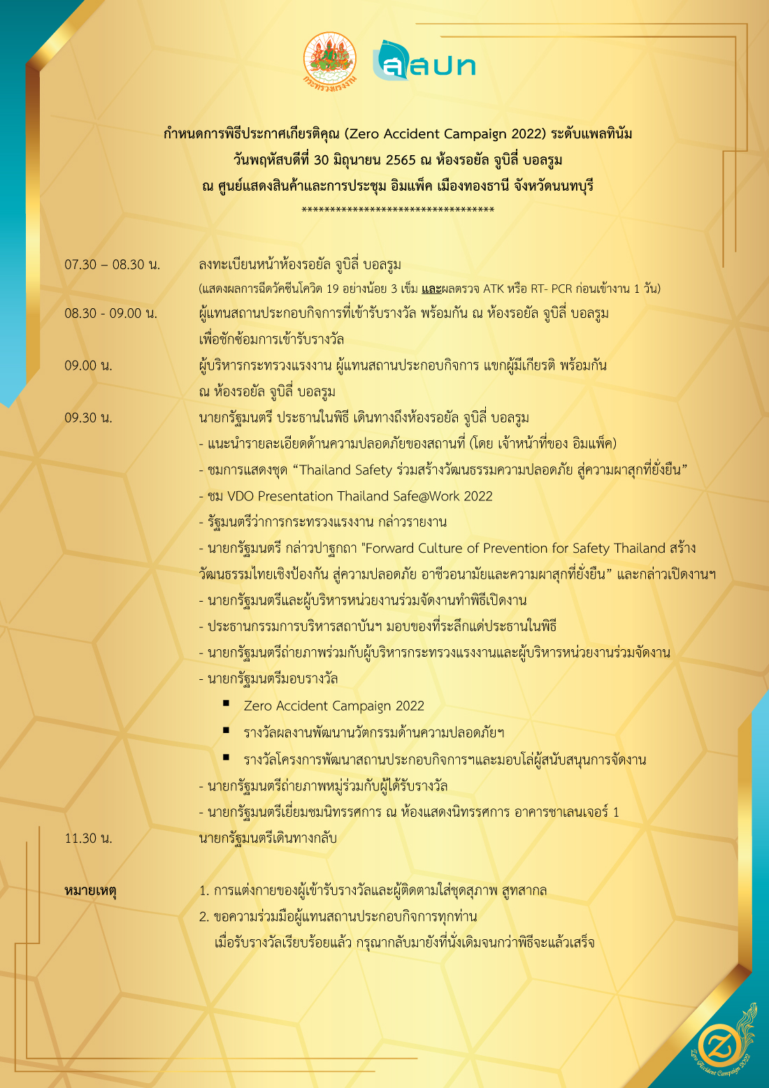 สถาบันส่งเสริมความปลอดภัยฯ ได้กำหนดให้มีพิธีมอบโล่ประกาศเกียรติคุณระดับแพลทินัม โดย พลเอก ประยุทธ์ จันทร์โอชา นายกรัฐมนตรี ในงานความปลอดภัยและอาชีวอนามัยแห่งชาติ ครั้งที่ 34 วันพฤหัสบดีที่ 30 มิถุนายน 2565 ณ ห้อง Royal Jubilee Ballroom ศูนย์แสดงสินค้าและการประชุม อิมแพ็ค เมืองทองธานี จังหวัดนนทบุรี (ตามกำหนดการด้านล่าง) ทั้งนี้สถานประกอบกิจการที่ได้รับการประกาศเกียรติคุณระดับแพลทินัม สามารถลงทะเบียนเข้าร่วมพิธีมอบในงานฯ ได้ที่ลิงก์ด้านล่างนี้ (ภายในวันที่ 14 มิถุนายน 2565) สำหรับการรับโล่และใบประกาศเกียรติคุณในระดับอื่น ๆ สถาบันฯ จะแจ้งวิธีการและกำหนดการให้ทราบอีกครั้งในภายหลัง