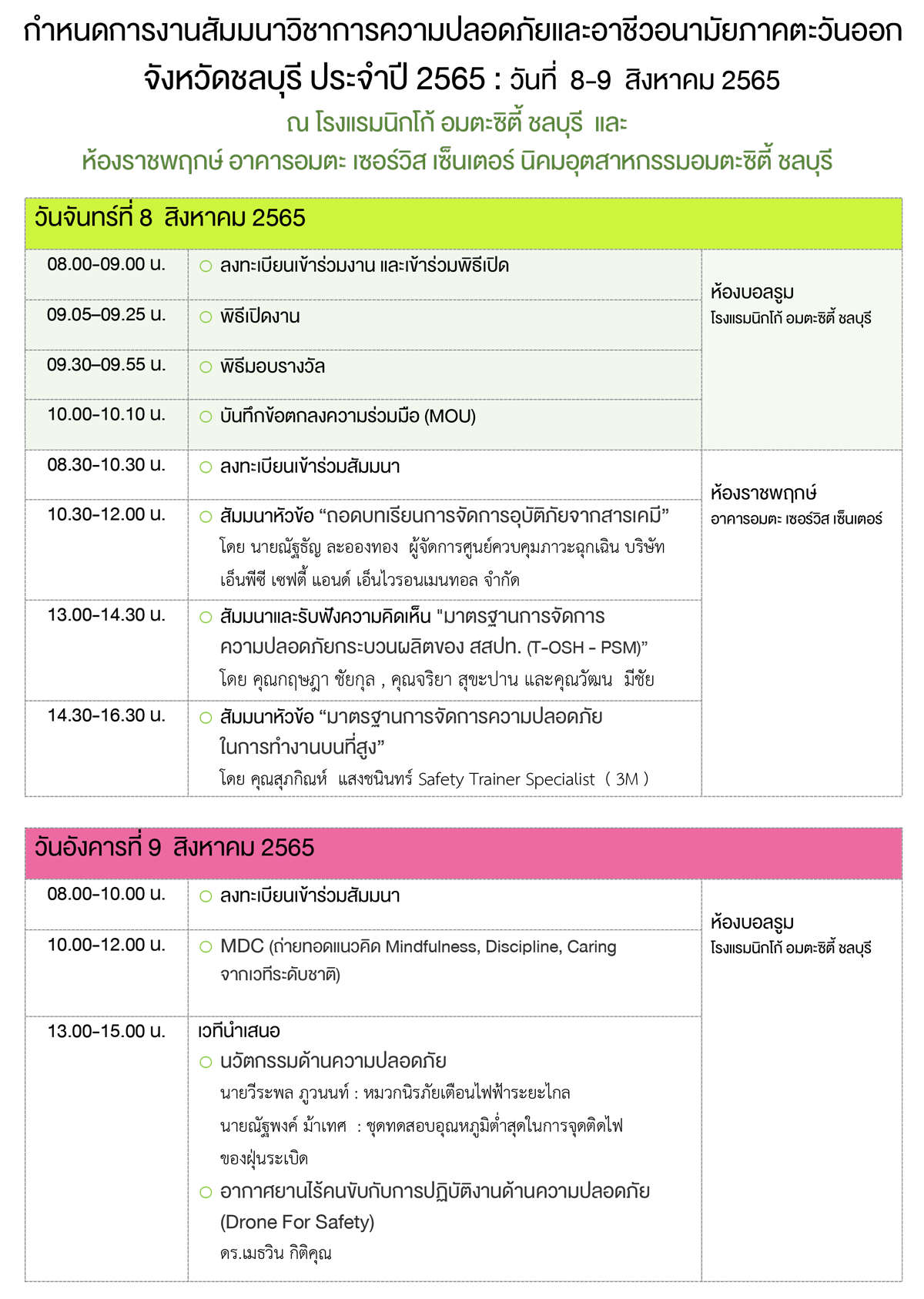 กระทรวงแรงงาน โดยสถาบันส่งเสริมความปลอดภัย อาชีวอนามัย และสภาพแวดล้อมในการทำงาน(องค์การมหาชน) หรือ สสปท. กำหนดจัดงานสัมมนาวิชาการความปลอดภัยและอาชีวอนามัยภาคตะวันออก จังหวัดชลบุรี ประจำปี 2565 ระหว่างวันที่ 8-9 สิงหาคม 2565 ณ โรงแรมนิกโก้ อมตะ ซิตี้ ชลบุรี นิคมอุตสาหกรรมอมตะ ซิตี้ จังหวัดชลบุรี โดยนำองค์ความรู้จากการจัดงานความปลอดภัยและอาชีวอนามัยแห่งชาติ ครั้งที่ 34 มาถ่ายทอดสู่ส่วนภูมิภาค เพื่อให้บุคลากรในองค์กรต่าง ๆ ทราบทิศทางและความเคลื่อนไหวของการพัฒนาการงานความปลอดภัยและอาชีวอนามัยในประเทศและในระดับสากล รวมทั้งเพื่อพัฒนาศักยภาพบุคลากรด้านความปลอดภัยในการทำงานของสถานประกอบกิจการ เพื่อรณรงค์และกระตุ้นจิตสำนึกด้านความปลอดภัยในการทำงาน เป็นศูนย์กลางถ่ายทอดและแลกเปลี่ยนองค์ความรู้และประสบการณ์ด้านความปลอดภัย อาชีวอนามัย และสภาพแวดล้อมในการทำงาน รวมทั้งเพื่อพัฒนาศักยภาพบุคลากร ด้านความปลอดภัยในการทำงานของสถานประกอบกิจการในภูมิภาค โดยกิจกรรมภายในงานประกอบด้วย การสัมมนาวิชาการ การแสดงนิทรรศการจากภาครัฐและเอกชน