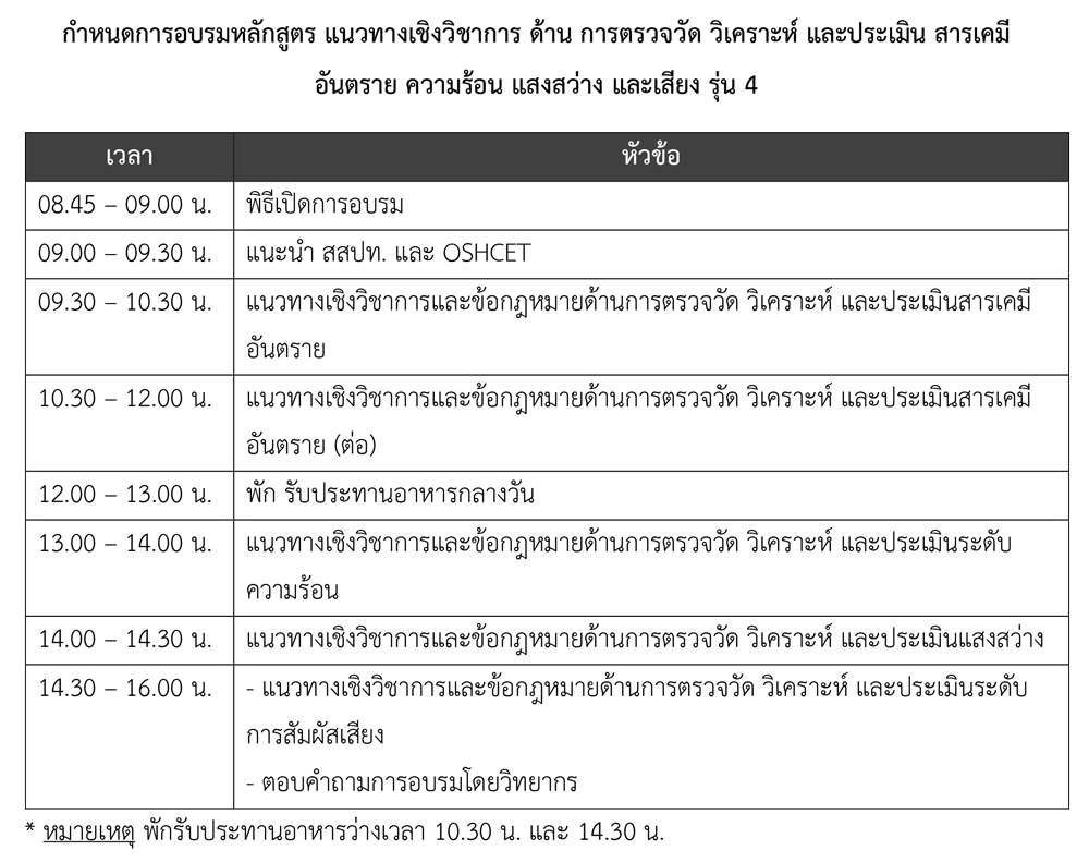 • ขอสงวนสิทธิ์สำหรับบุคลากรของสถานประกอบกิจการหรือหน่วยงานละ 1 ท่าน/สิทธิการเข้าอบรม โดยผู้ที่สมัครเข้าร่วมอบรมฯ ต้องสามารถเข้าร่วมอบรมตามวันและเวลาในกำหนดการตลอดทั้งวัน