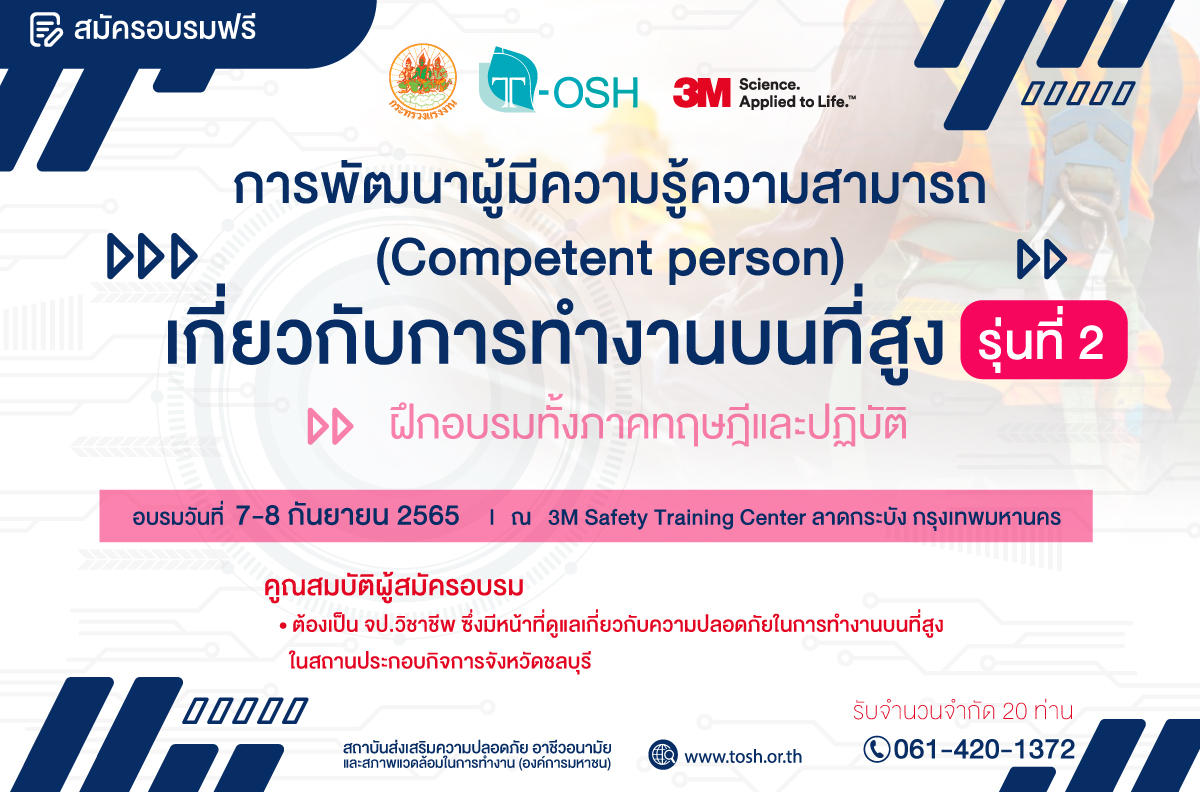 สถาบันส่งเสริมความปลอดภัย อาชีวอนามัย และสภาพแวดล้อมในการทำงาน (องค์การมหาชน) ได้จัดทำโครงการส่งเสริมความปลอดภัยและอาชีวอนามัยภูมิภาคตะวันออก โดยเน้นการให้บริการด้านความปลอดภัยฯ ในพื้นที่ภาคตะวันออก ซึ่งปี 2565 ศูนย์ประสานงานและเตรียมความพร้อมในการขับเคลื่อนภารกิจการส่งเสริมความปลอดภัย และอาชีวอนามัยภูมิภาคตะวันออก (Occupational Safety and Health Center in Eastern Thailand : OSHCET) โดยร่วมกับ บริษัท 3 เอ็ม ประเทศไทย จำกัด กำหนดจัดอบรม “การพัฒนาผู้มีความรู้ความสามารถ (Competent person) เกี่ยวกับการทำงานบนที่สูง รุ่นที่ 2” เพื่อถ่ายทอดองค์ความรู้ และพัฒนาศักยภาพบุคลากร ผู้ใช้แรงงานด้านความปลอดภัยนำไปสู่การลดการประสบอันตรายจากการทำงาน จึงขอเชิญชวนเจ้าหน้าที่ความปลอดภัยในการทำงานระดับวิชาชีพ ของสถานประกอบกิจการและหน่วยงานที่เกี่ยวข้องในพื้นที่จังหวัดขลบุรี สมัครเข้าร่วมการฝึกอบรมฯ (สมัครฟรี ได้รับใบประกาศนียบัตรออนไลน์)