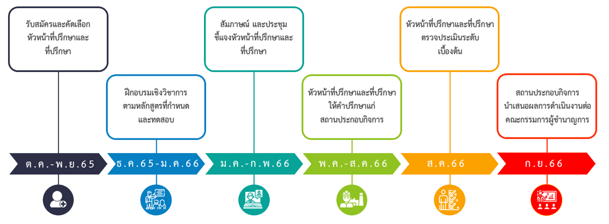 - เปิดรับสมัครบุคลากรที่สนใจสมัครเป็นหัวหน้าที่ปรึกษา และที่ปรึกษามาตรฐานระบบการจัดการด้านความปลอดภัย อาชีวอนามัย และสภาพแวดล้อมในการทำงาน