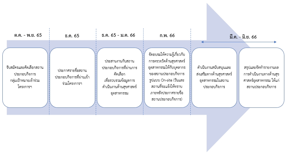 เพื่อเป็นการส่งเสริม สนับสนุน พัฒนาศักยภาพของบุคลากรในสถานประกอบกิจการให้สามารถดำเนินงานด้านความปลอดภัย อาชีวอนามัย และสภาพแวดล้อมในการทำงาน และเผยแพร่องค์ความรู้ด้าน สุขศาสตร์อุตสาหกรรมอย่างต่อเนื่อง สสปท. จึงขอเชิญชวนสถานประกอบกิจการเข้าร่วม โครงการพัฒนาและให้คำแนะนำแก่สถานประกอบกิจการด้านสุขศาสตร์อุตสาหกรรม ประจำปี 2566 โดยสถานประกอบกิจการที่เข้าร่วมโครงการฯ จะได้รับการอบรมและการสนับสนุนเครื่องมือในการตรวจวัดสุขศาสตร์อุตสาหกรรมเกี่ยวกับความร้อน แสงสว่าง เสียง ฝุ่น สารเคมี และโลหะหนัก (สถานประกอบกิจการเขตภาคใต้ จะได้รับบริการเฉพาะด้านความร้อน แสงสว่าง และเสียง) โดยไม่มีค่าใช้จ่ายในการดำเนินการ