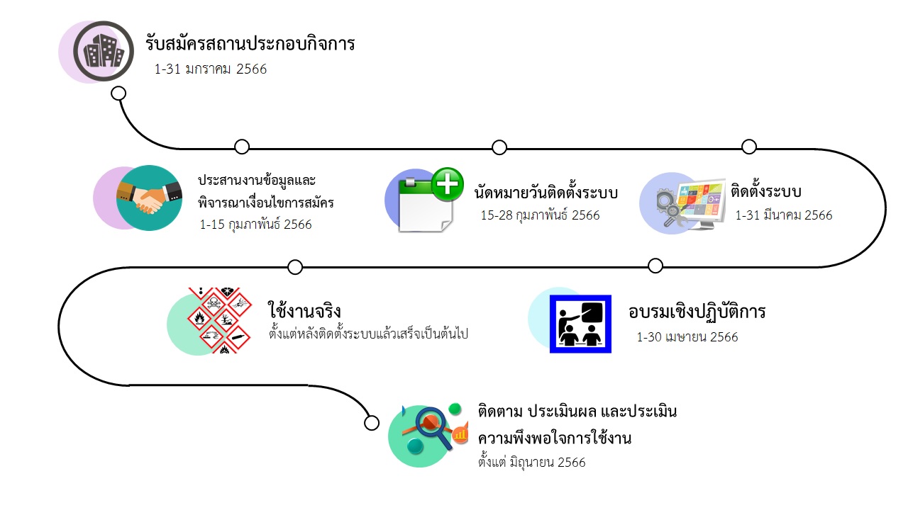 - สถานประกอบกิจการที่สมัครเข้าร่วมใช้งาน จะได้รับการส่งเสริม สนับสนุน และแก้ไขปัญหาข้อบกพร่องโดยไม่เสียค่าใช้จ่ายตลอดโครงการ