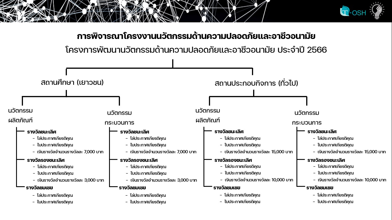 - เป็นโครงงานสิ่งประดิษฐ์คิดค้น หรือกระบวนการทำงานต่าง ๆ ที่เกี่ยวข้องกับความปลอดภัยและ อาชีวอนามัยเท่านั้น