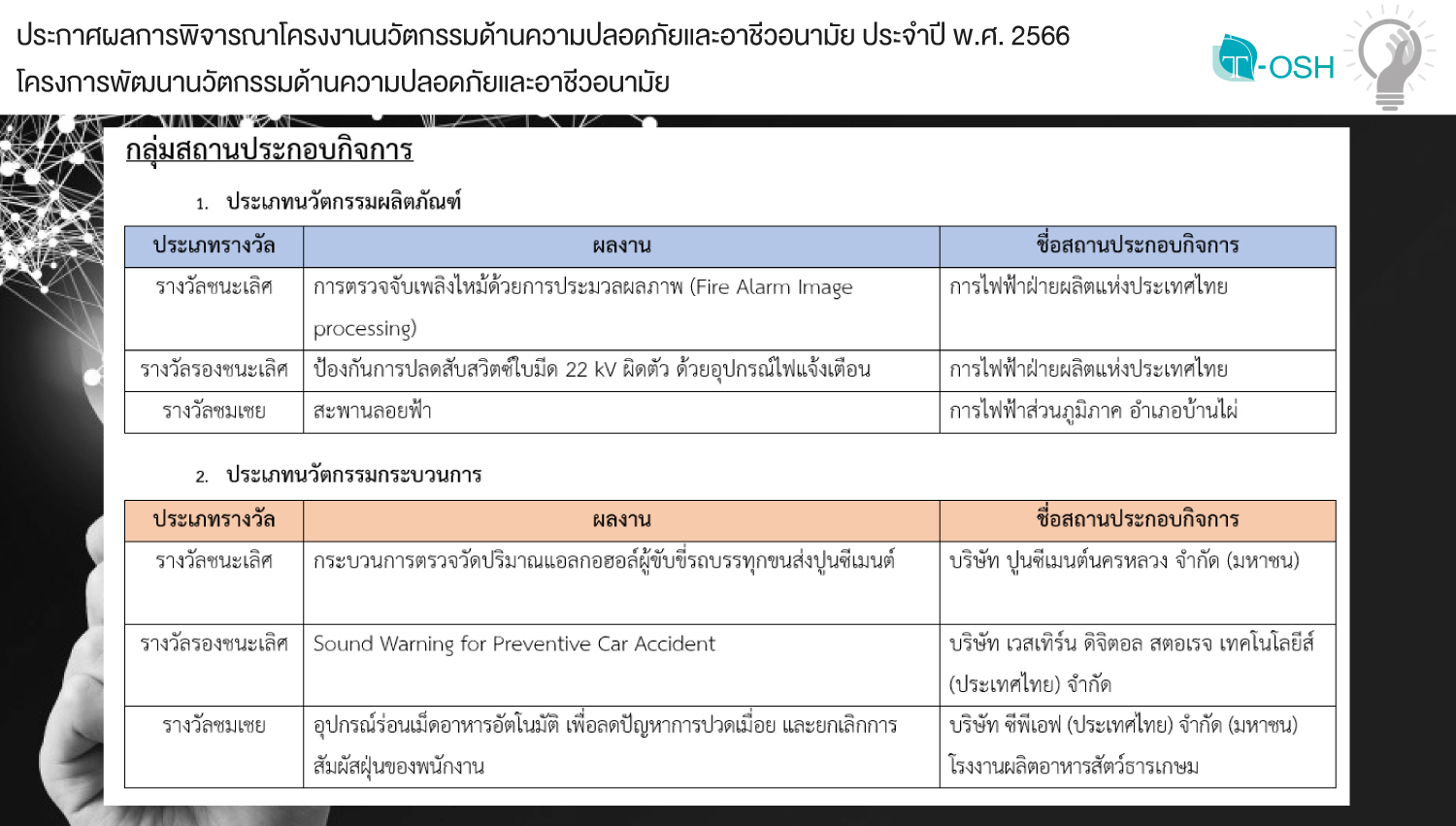 - ประกาศผลการคัดเลือกสถานประกอบกิจการเพื่อนำเสนอโครงงาน ภายในวันที่ 15 มีนาคม 2566 / ประกาศผลสถานประกอบกิจการที่ได้รับรางวัลโครงงานพัฒนานวัตกรรมด้านความปลอดภัยและอาชีวอนามัย ภายในวันที่ 28 เมษายน 2566 ผ่านเว็บไซต์ www.tosh.or.th