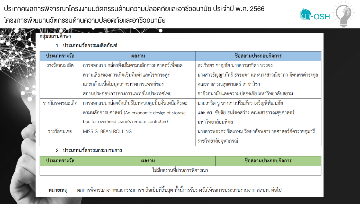 สถาบันส่งเสริมความปลอดภัยฯ ขอเชิญชวนสถานประกอบกิจการ เจ้าหน้าที่ความปลอดภัยในการทำงาน สถาบันการศึกษา หรือหน่วยงานทั้งภาครัฐและเอกชนที่สนใจ ร่วมส่งผลงานเข้าร่วมพิจารณาโครงงานพัฒนานวัตกรรมด้านความปลอดภัยและอาชีพในสถานประกอบกิจการด้านความปลอดภัยและอาชีวอนามัยและลดการประสบอันตรายหรือเจ็บป่วยจากการทำงานของผู้ปฎิบัติงาน