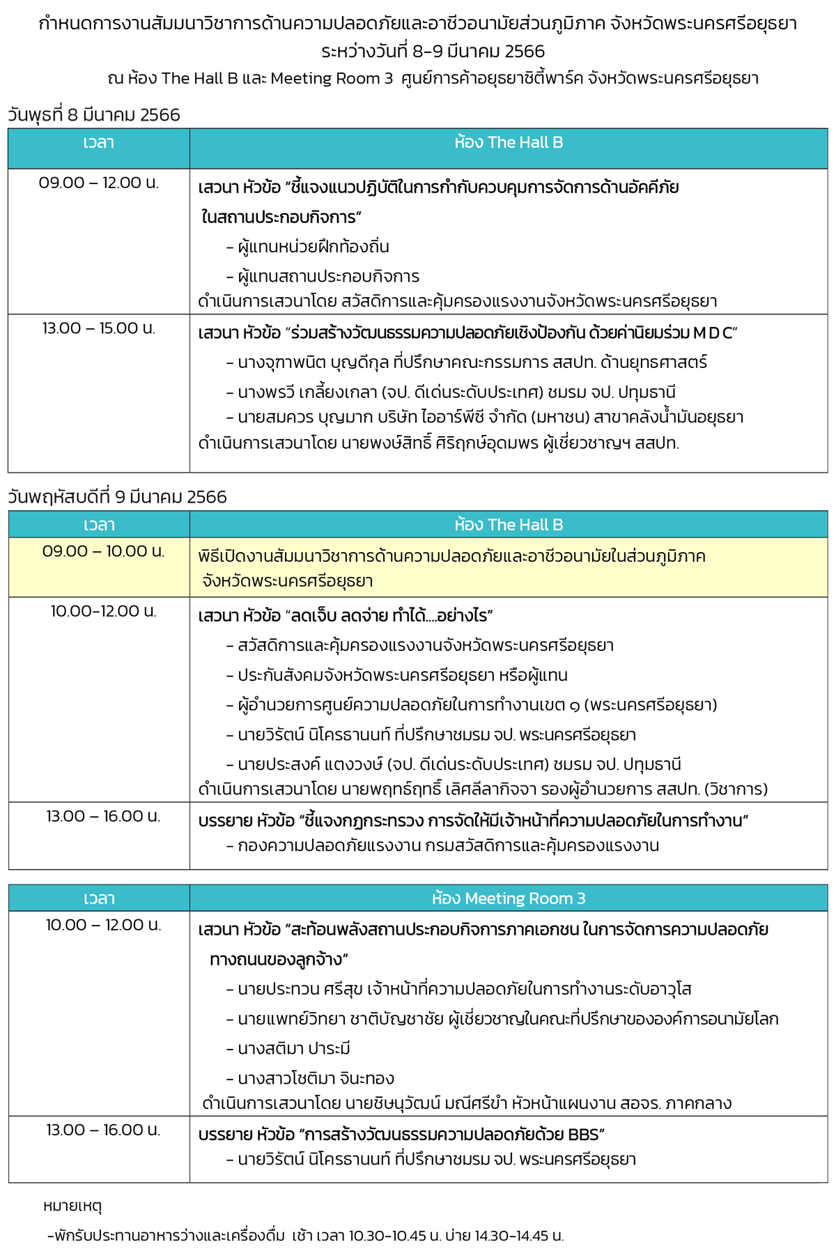 สถาบันส่งเสริมความปลอดภัย อาชีวอนามัย และสภาพแวดล้อมในการทำงาน (องค์การมหาชน) กำหนดจัดงานสัมมนาวิชาการด้านความปลอดภัยและอาชีวอนามัยส่วนภูมิภาค จังหวัดพระนครศรีอยุธยา ประจำปี 2566 ระหว่างวันที่ 8-9 มีนาคม 2566 ณ ศูนย์การค้าอยุธยาซิตี้พาร์ค ชั้น 2 (The Hall) จังหวัดพระนครศรีอยุธยา เพื่อให้นายจ้าง ลูกจ้าง ผู้ที่เกี่ยวข้องทั้งภาครัฐ และภาคเอกชน ตระหนักถึงความสำคัญในเรื่องความปลอดภัย อาชีวอนามัย และสภาพแวดล้อมในการทำงาน รวมทั้งเพื่อพัฒนาศักยภาพบุคลากรด้านความปลอดภัยในการทำงานของสถานประกอบกิจการ ภายใต้แนวคิด ร่วมสร้างวัฒนธรรมไทยเชิงป้องกัน สู่ความปลอดภัย อาชีวอนามัย และความผาสุกที่ยั่งยืน (Forward Culture of Prevention for Safety Thailand) โดยงานดังกล่าวจัดให้มีการสัมมนาวิชาการ การแสดงนิทรรศการจากภาครัฐและเอกชน เพื่อเสริมสร้างการพัฒนาแลกเปลี่ยนเรียนรู้ ประสบการณ์ทางวิชาการให้กับผู้เข้าร่วมงาน