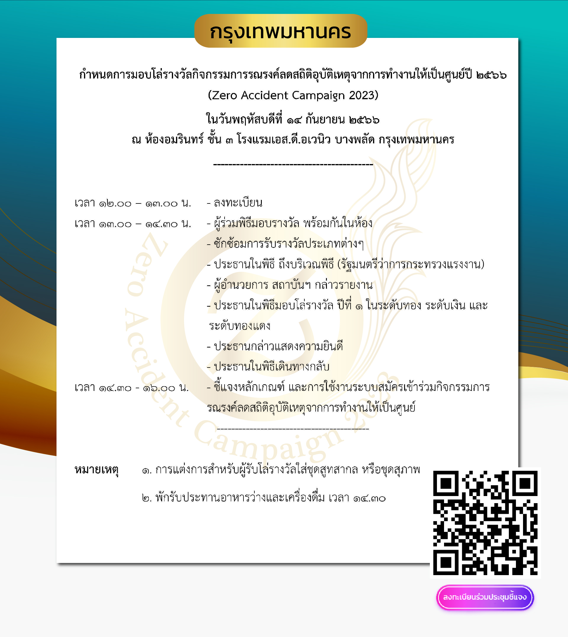 สถาบันส่งเสริมความปลอดภัย อาชีวอนามัย และสภาพแวดล้อมในการทำงาน (องค์การมหาชน) กำหนดจัดประชุมชี้แจงการใช้งานระบบสมัครกิจกรรมการรณรงค์ลดสถิติอุบัติเหตุจากการทำงานให้เป็นศูนย์ (Zero Accident Campaign) จึงขอเชิญชวนสถานประกอบกิจการที่เข้าร่วมกิจกรรมต่อเนื่องและสถานประกอบกิจการที่ประสงค์เข้าร่วมกิจกรรมครั้งแรก เข้ารับฟังการชี้แจงการใช้ระบบ และขั้นตอนวิธีการสมัครการเข้าร่วมกิจกรรมณรงค์ลดสถิติอุบัติเหตุจากการทำงานให้เป็นศูนย์ ประจำปี 2567 Zero Accident Campaign 2024 ครั้งที่ 1 วันที่ 14 กันยายน 2566 เวลา 13.00 น. ณ ห้องอมรินทร์ ชั้น 3 โรงแรมเอส.ดี.อเวนิว บางพลัด กรุงเทพมหานคร และครั้งที่ 2 วันที่ 28 กันยายน 2566 เวลา 08.30 น. ณ ห้องทานตะวัน โรงแรมหาดใหญ่ พาราไดซ์ โฮเทล แอนด์ รีสอร์ท อำเภอหาดใหญ่ จังหวัดสงขลา โดยสามารถลงทะเบียนเข้ารับฟังการชี้แจงได้ที่ลิงก์ด้านล่างนี้ (ลงทะเบียนเข้าฟังฟรี รับสมัครจำนวนจำกัด)