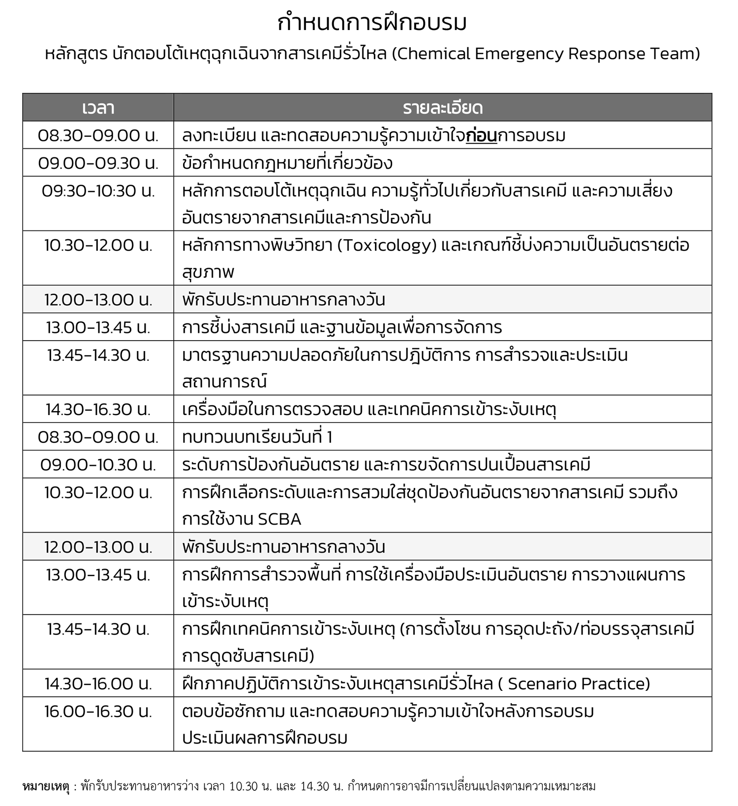 ศูนย์ส่งเสริมความปลอดภัยและอาชีวอนามัยภูมิภาคตะวันออก (Occupational Safety and Health Center in Eastern Thailand : OSHCET) ออกแบบ หลักสูตรนักตอบโต้เหตุฉุกเฉินจากสารเคมีรั่วไหล (Chemical Emergency Response Team) เพื่อเสริมสร้างความรู้ทั้งเชิงทฤษฎีและทักษะการปฏิบัติเมื่อต้องเผชิญเหตุการณ์สารเคมีอันตรายรั่วไหลให้แก่นักตอบโต้เหตุฉุกเฉิน เจ้าหน้าที่ความปลอดภัยในการทำงาน และบุคคลอื่นที่เกี่ยวข้อง ให้สามารถบริหารจัดการสถานการณ์และปฏิบัติงานได้อย่างปลอดภัยและเกิดความสูญเสียน้อยที่สุด
