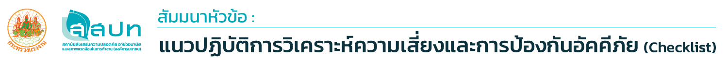 สถาบันส่งเสริมความปลอดภัย อาชีวอนามัย และสภาพแวดล้อมในการทำงาน (องค์การมหาชน) กำหนดจัดสัมมนาเชิงปฏิบัติการ หัวข้อ : แนวปฏิบัติการวิเคราะห์ความเสี่ยงและการป้องกันอัคคีภัย (Checklist) จำนวน 4 รุ่น เพื่อส่งเสริมความรู้ แนวทาง และแนวปฏิบัติ ให้กับนายจ้าง ลูกจ้าง ในสถานประกอบกิจการ หรือผู้สนใจทั่วไป สามารถนำองค์ความรู้ที่ได้ไปขยายผล ปรับปรุง พัฒนา เพื่อให้เกิดความปลอดภัยในการทำงานอย่างเป็นรูปธรรม สถาบันฯ จึงขอเชิญชวนสถานประกอบกิจการ หน่วยงานหรือผู้ที่สนใจ สมัครเข้าร่วมการสัมมนาในหัวข้อดังกล่าวโดยไม่เสียค่าใช้จ่าย ทั้งนี้ผู้เข้าสัมมนาจะได้รับใบประกาศนียบัตรอิเล็กทรอนิกส์เมื่อเสร็จสิ้นการสัมมนา